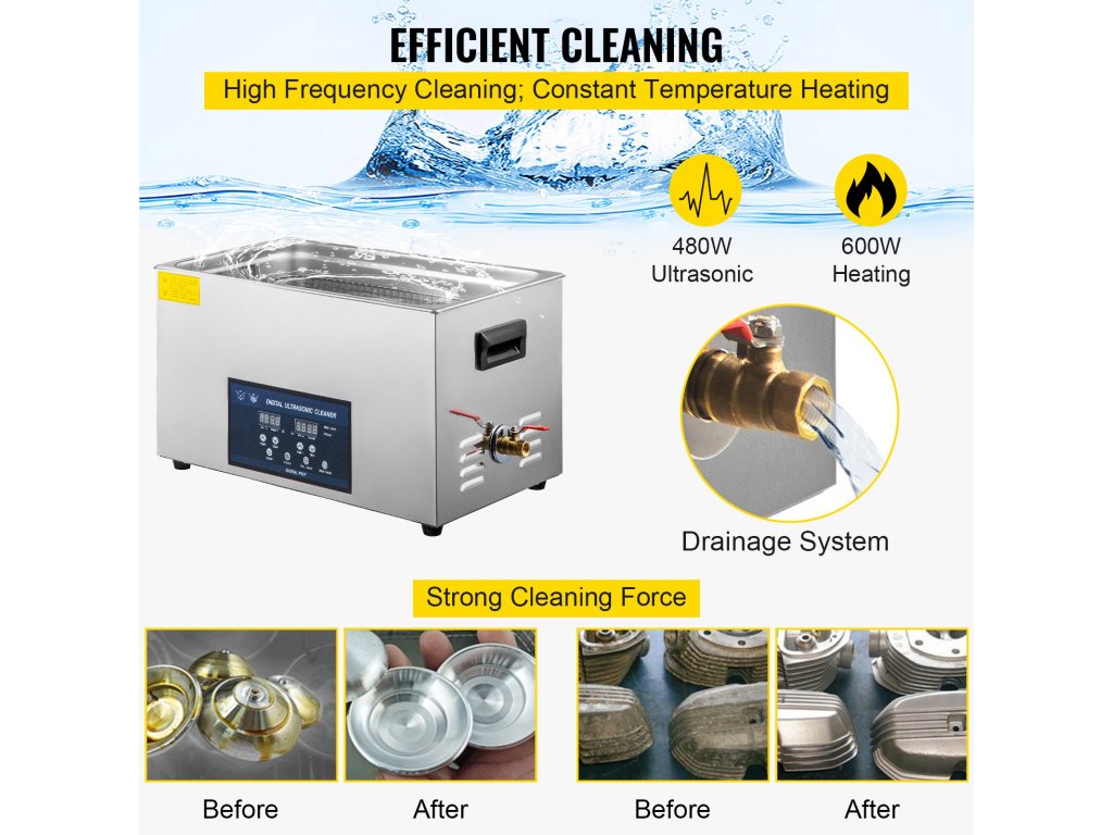 40KHz-es ultrahangos hullámok bonyolult formájú felületű dolgok, vak lyukak tisztítására; 28KHz-es ultrahangos hullámok kis vagy egyszerű tárgyak tisztítására. Több millió mikroszkopikus buborékot termel a felületen lévő foltok hatékony eltávolításához.