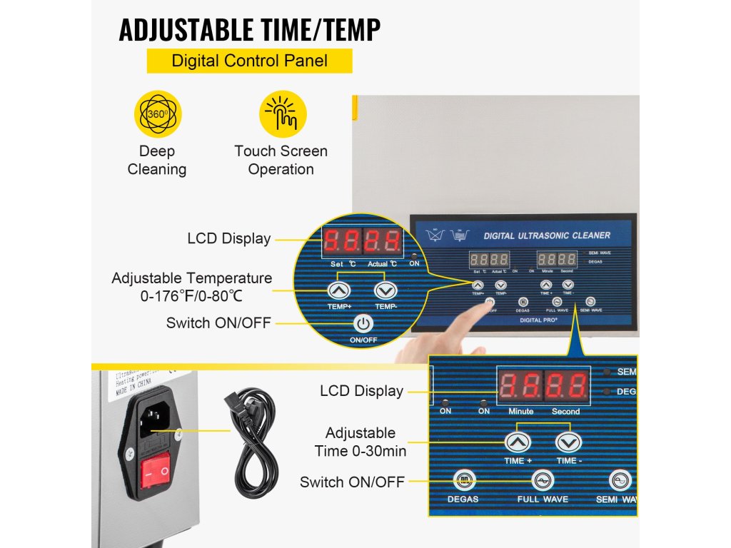 Erőteljes, állandóan működő tisztítási idő: 0-30 perc (állítható); gyorsan felmelegíti az oldatokat 0-80 ℃ hőmérsékletre (állítható). Mikrochip vezérelt fűtési és tisztítási ciklus. LED kijelzővel és gombokkal az üzemmódok megjelenítéséhez és kiválasztásához.
