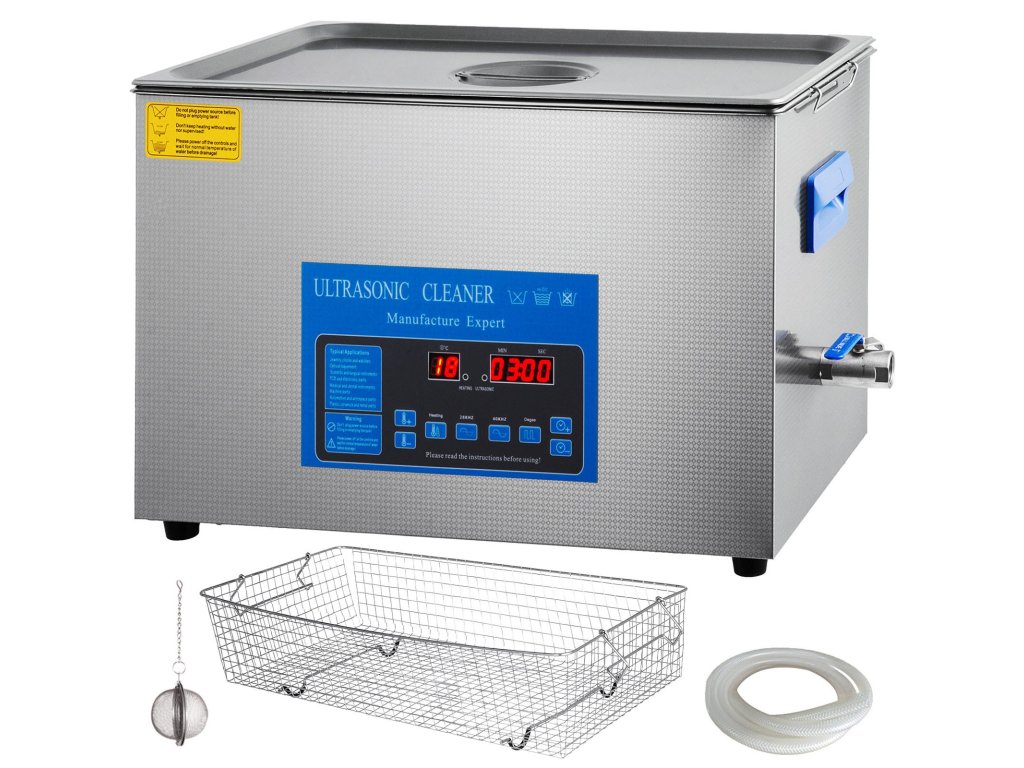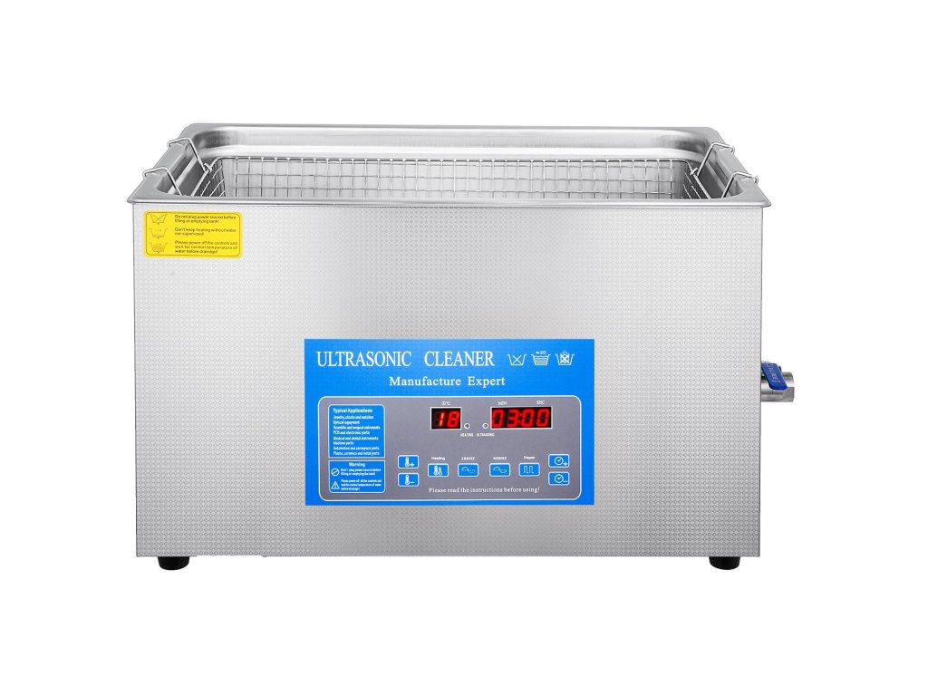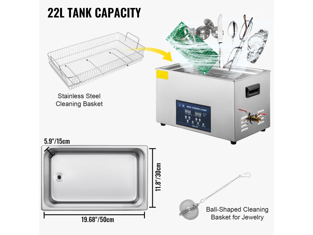 Professzionális ultrahangos mosógép 22 l kapacitással, amely számos területen használható - ékszerek: fülbevalók, nyakláncok, gyémántok; szemüvegek: napszemüvegek, optikai lencsék, kontaktlencsék; fogászati eszközök: borotvák, műfogsorok, tetováló pisztolyok; használati eszközök: eszközök: villák, kések, kanalak, szelepek stb.