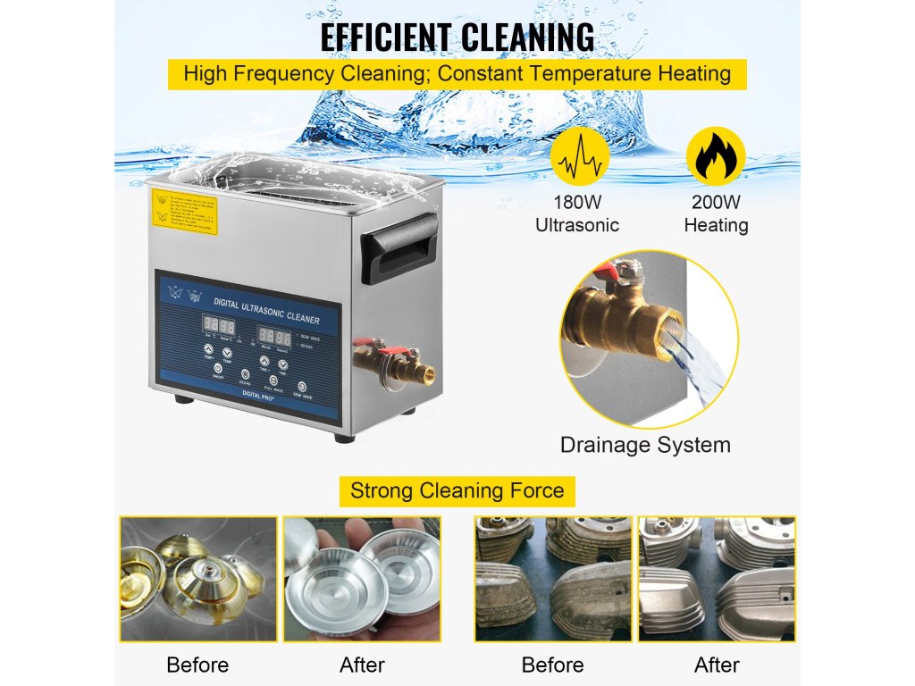 Professzionális ultrahangos mosógép 6 l kapacitással, amely számos területen használható - ékszerek: fülbevalók, nyakláncok, gyémántok; szemüvegek: napszemüvegek, optikai lencsék, kontaktlencsék; fogászati eszközök: borotvák, műfogsorok, tetováló pisztolyok; használati eszközök: eszközök: villák, kések, kanalak, szelepek stb.
