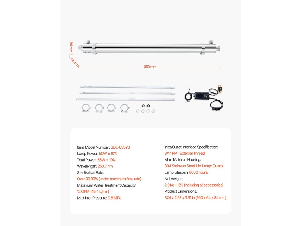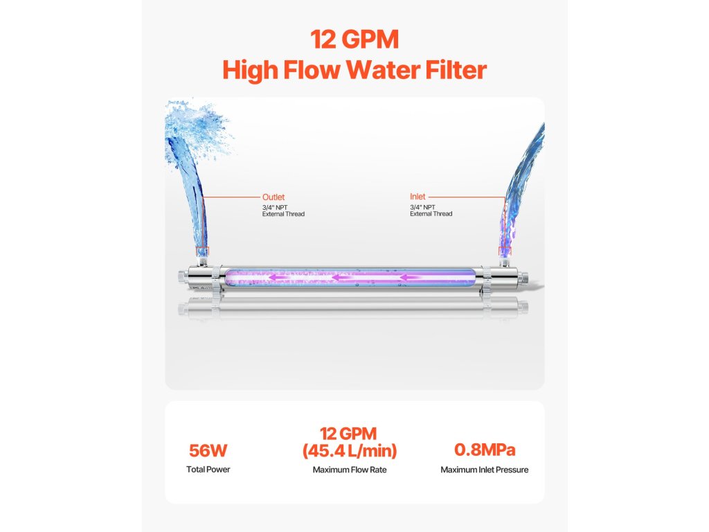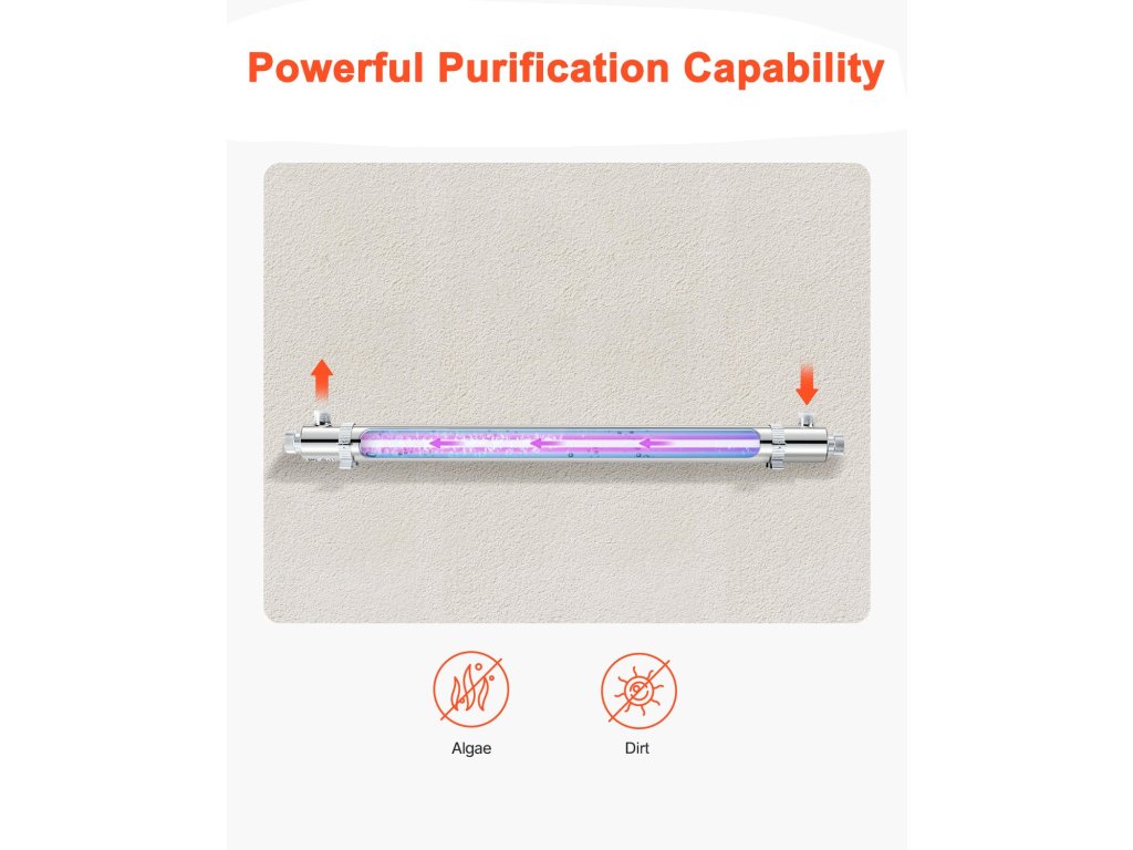 A víztisztító ultraibolya szűrője 99,99%-os sterilizálást biztosít a tiszta, baktériummentes vízért. A tartós rozsdamentes acél kamrával és az akár 8000 órás élettartamú UV-lámpával hosszú élettartamot garantál. Könnyen telepíthető és működtethető, élvezze a megtisztított vizet azonnal!