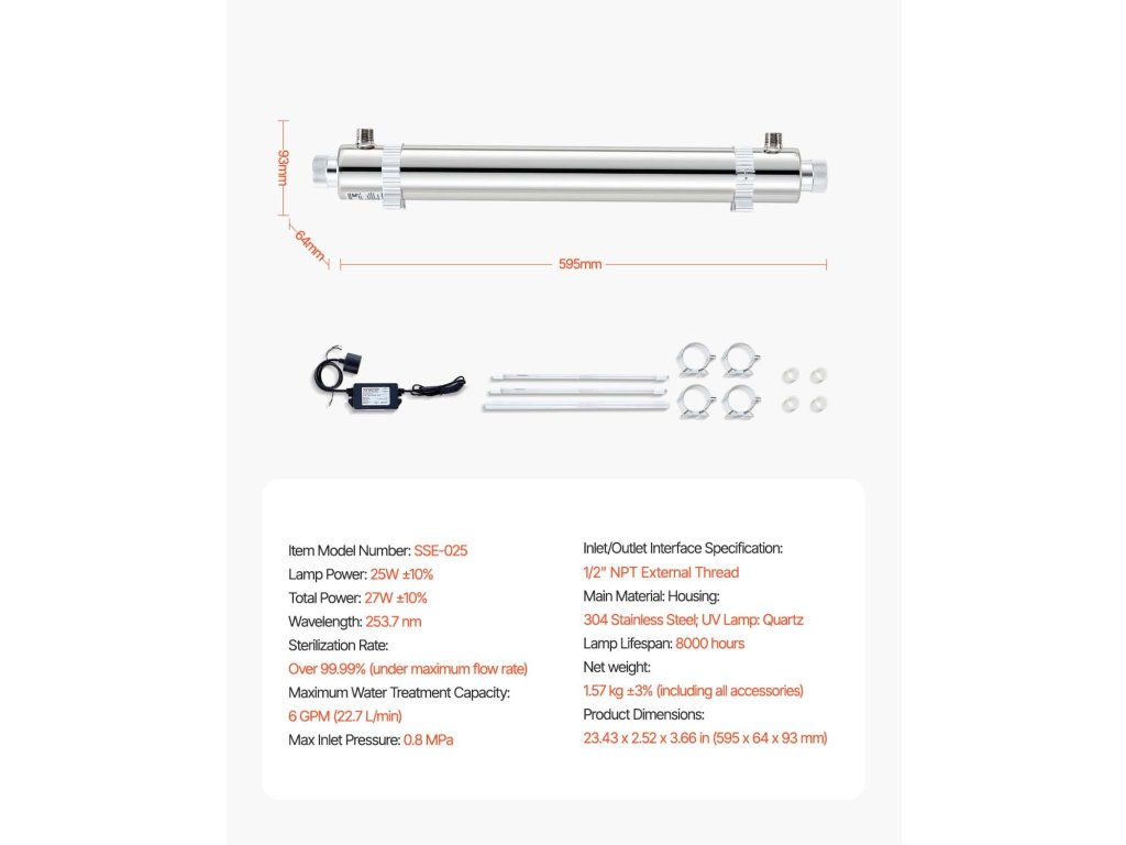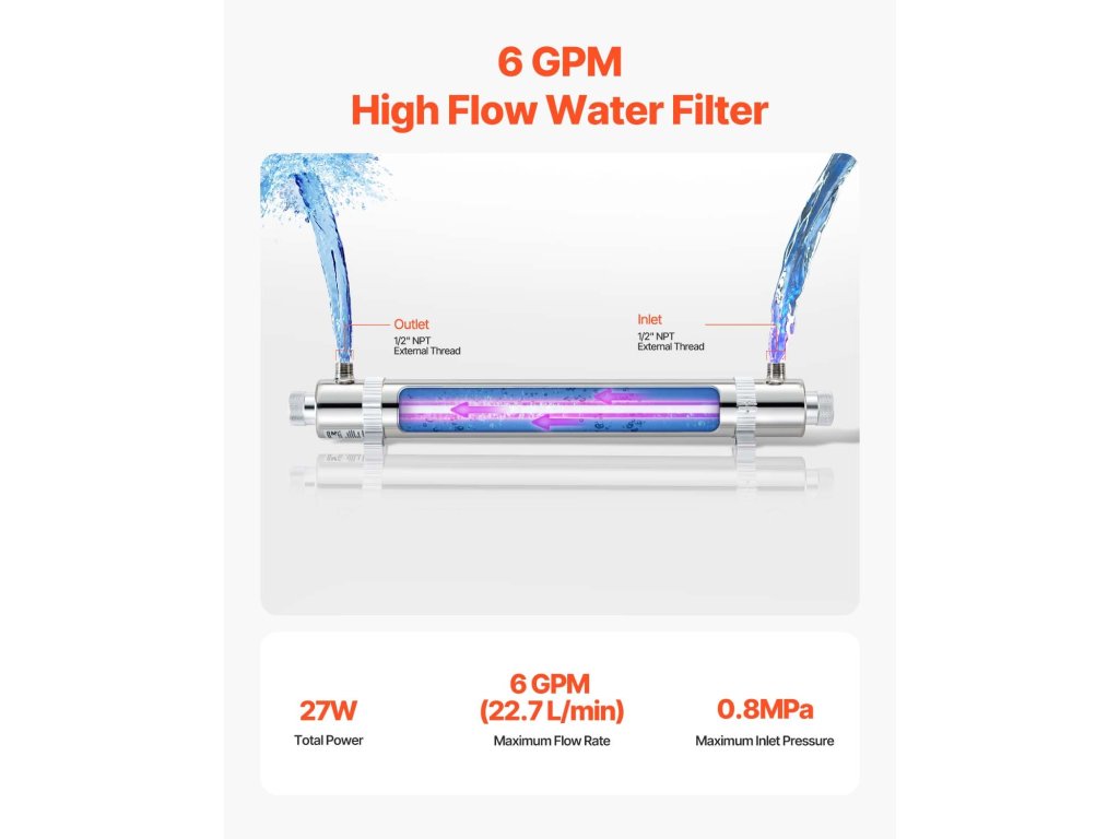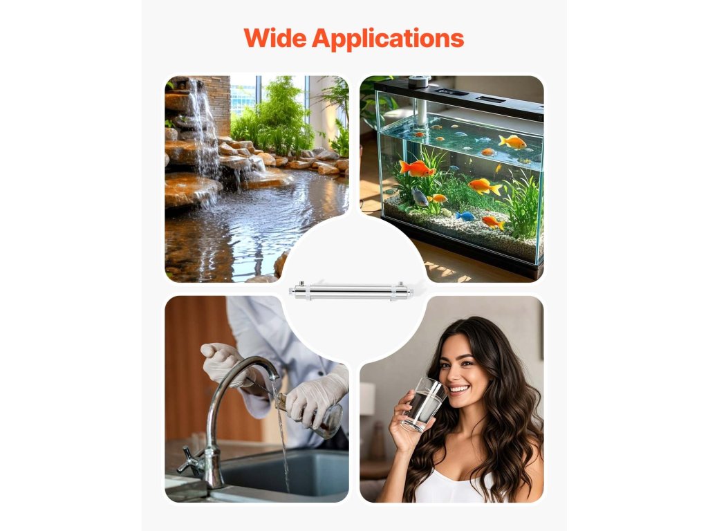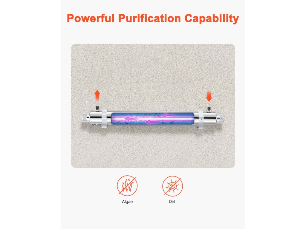 A víztisztító ultraibolya szűrője 99,99%-os sterilizálást biztosít a tiszta, baktériummentes vízért. A tartós rozsdamentes acél kamrával és az akár 8000 órás élettartamú UV-lámpával hosszú élettartamot garantál. Könnyen telepíthető és működtethető, élvezze a megtisztított vizet azonnal!