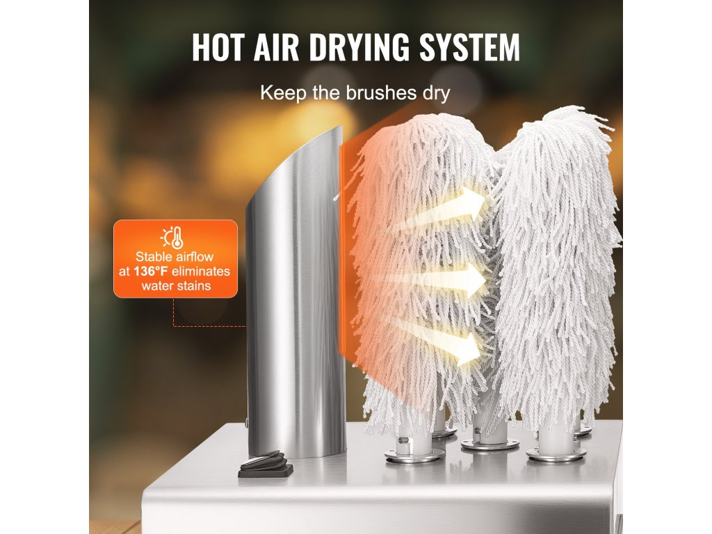 A nagyméretű forrólevegő ventilátorral felszerelt gép azonnali szárítást biztosít, hatékonyan megelőzve a vízfoltok kialakulását, miközben növeli a tisztítás hatékonyságát. Felgyorsítja a tisztítási időt, csökkentve a várakozási időt.