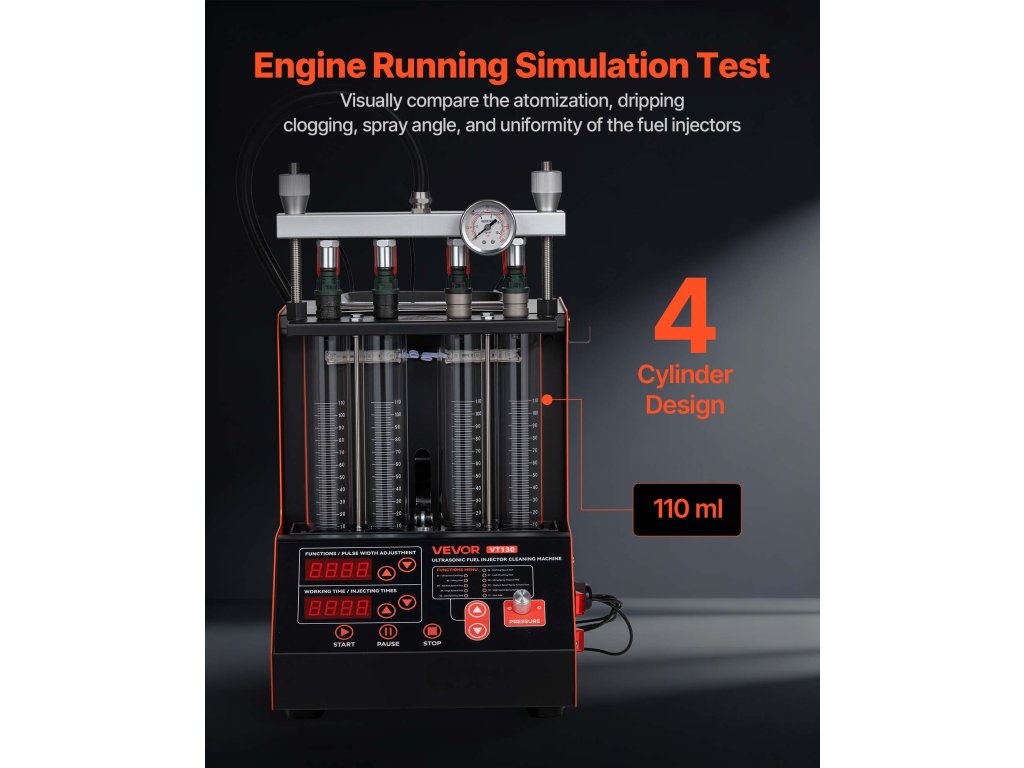 Teszteljen egyszerre 4 üzemanyag-befecskendezőt. A befecskendezőtisztító készülékünkkel könnyen megfigyelheti a porlasztást, a csepegést, az eltömődést, a porlasztási szöget és az egyenletességet.