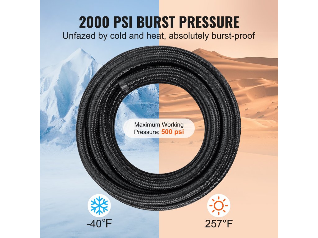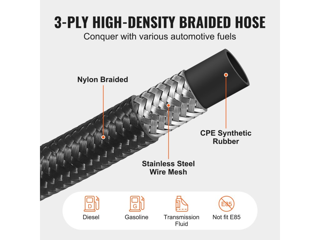 20 láb hosszú üzemanyagtömlő 3 rétegű nagy sűrűségű fonottal, kiváló nyomás- és kopásállósággal, -40 °F és 257 °F közötti hőmérsékletre alkalmas. Ideális az autóipari rajongók és a szakemberek számára egyaránt.
