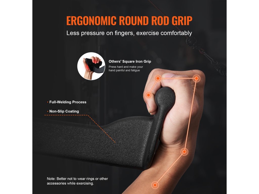A kerek rúd markolat szakértelemmel készült, teljes hegesztési eljárással és csúszásmentes kivitelben, amely minimálisra csökkenti az ujjakra és az ujjpercekre gyakorolt nyomást, növelve a gyakorlatok hatékonyságát és kényelmét.