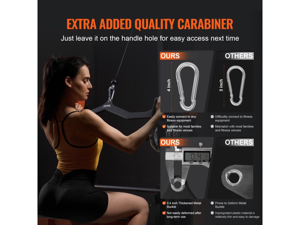 A mellékelt karabiner 4 hüvelykkel hosszabb, így könnyen rögzíthető bármilyen fitneszeszközhöz. Alkalmas a legtöbb otthoni és edzőtermi használatra.