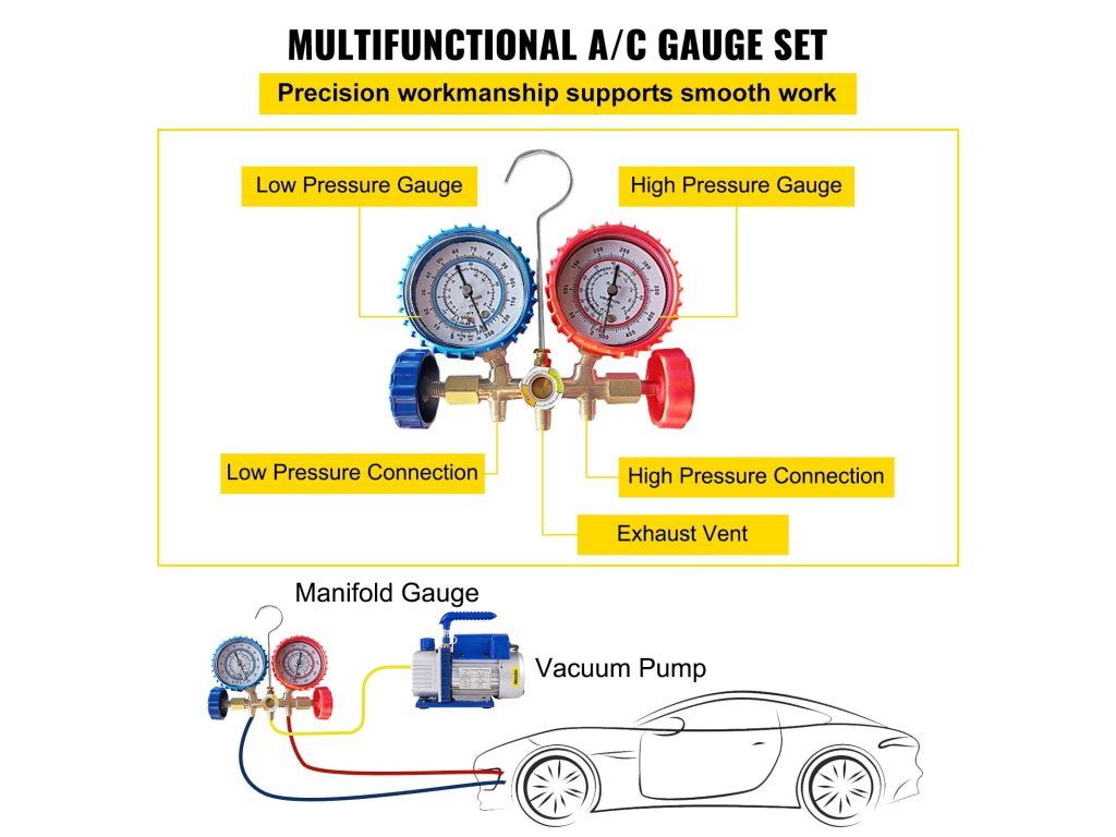 A HVAC szervizmérő készlet a hűtőközeg áramlásának kényelmes ellenőrzéséhez látóüveggel rendelkezik, a két szelepes elosztócső 1/4" SAE illesztéssel rendelkezik a hosszú élettartam érdekében, a kiváló minőségű mérőműszer pedig nagy pontosságú leolvasást biztosít.