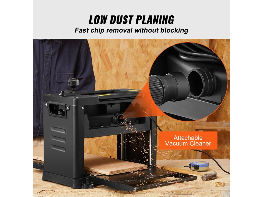 Elege van abból, hogy egyenetlen felületeket vagy vágásokat lát a fadarabokon? Próbálja ki a VEVOR 13" vastag gyalut, amelyet egy 15A 1800W-os motor hajt, 23500 fordulat/perc és 236 fordulat/perc előtolási sebességgel, optimális teljesítményt nyújtva a sík gyaluláshoz.