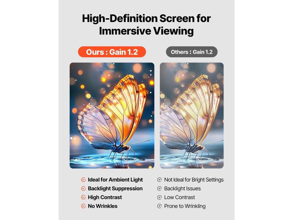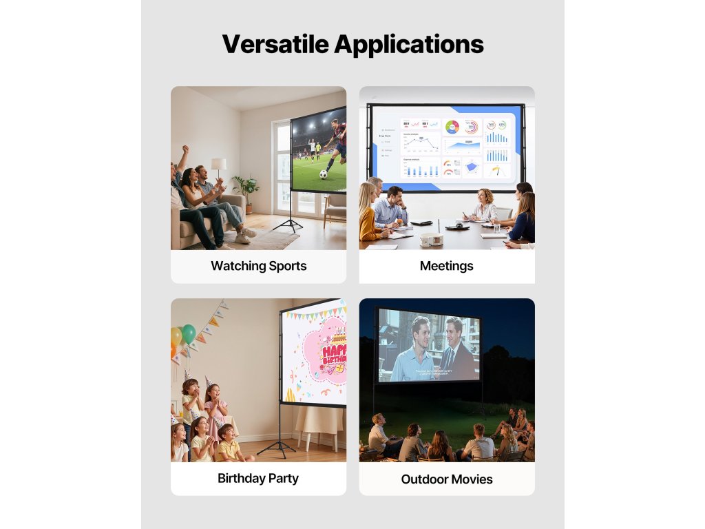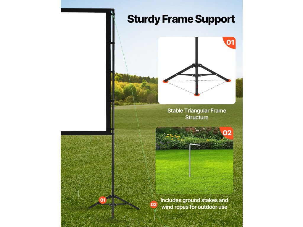 Ezt a kültéri mozivásznat úgy tervezték, hogy tiszta, nagy felbontású, gazdag színvilágú képet nyújtson. Kényelmes mérete és tartós szerkezete lehetővé teszi, hogy a családdal és a barátokkal együtt élvezhesse a moziélményt a szabadban és a beltérben egyaránt.
