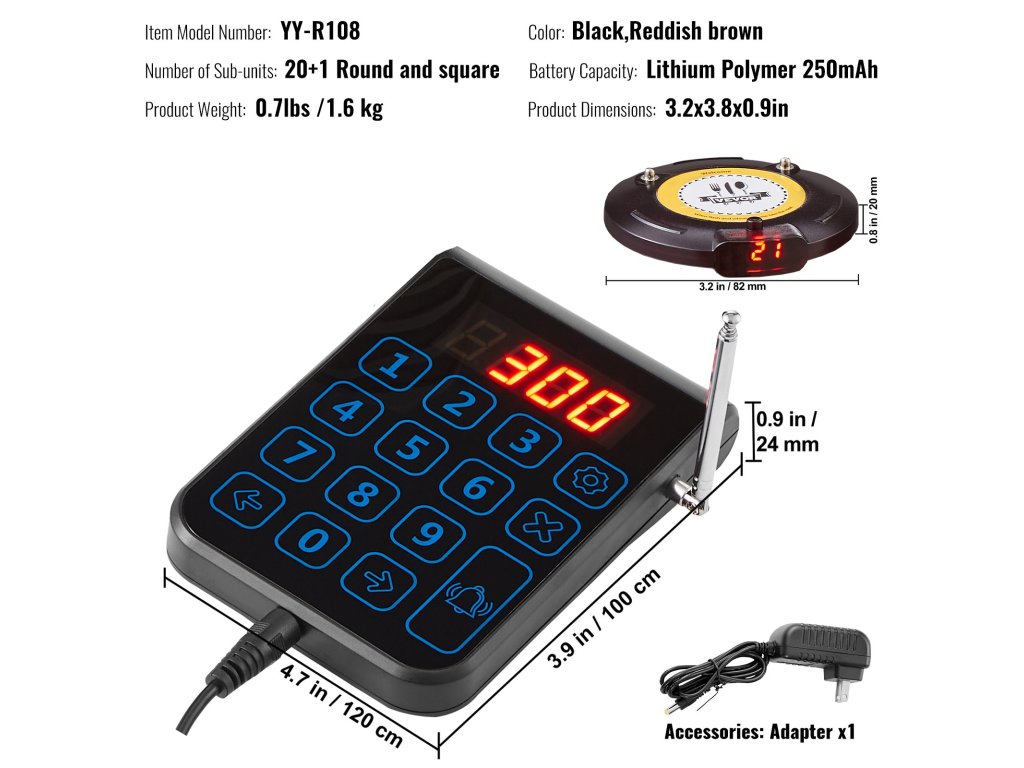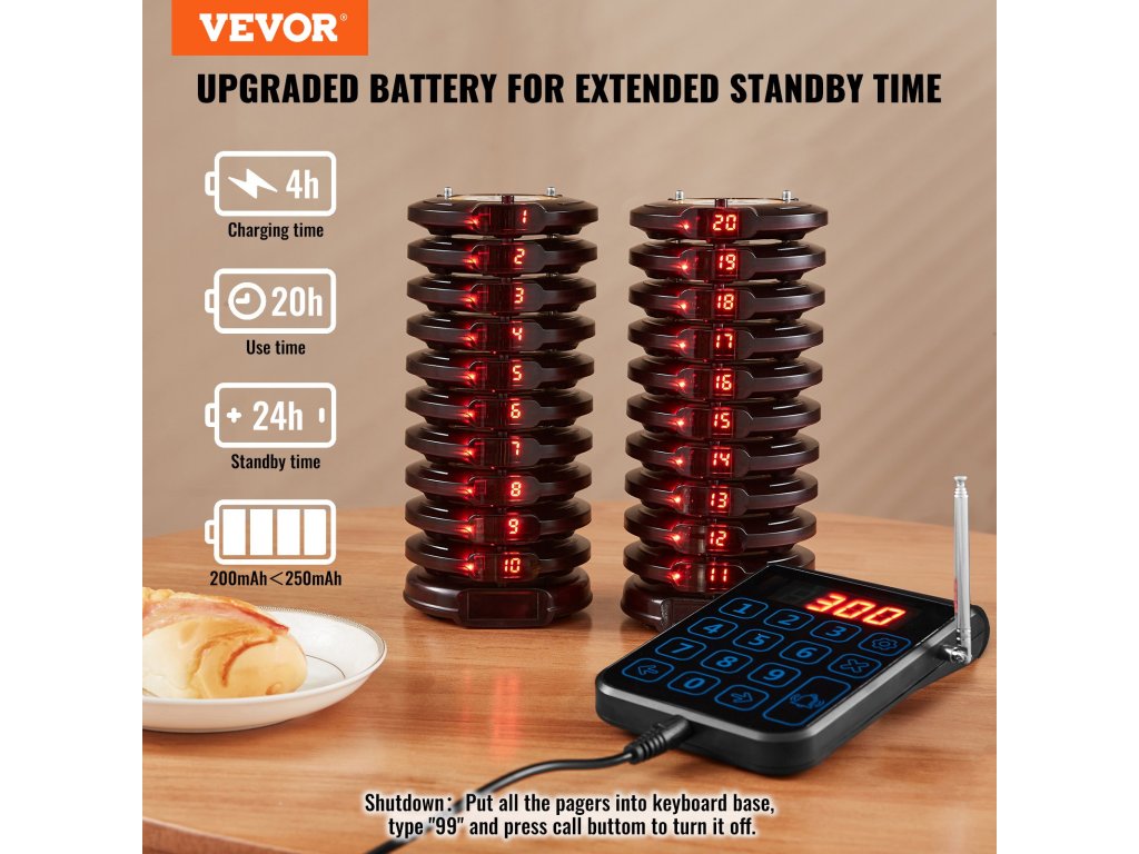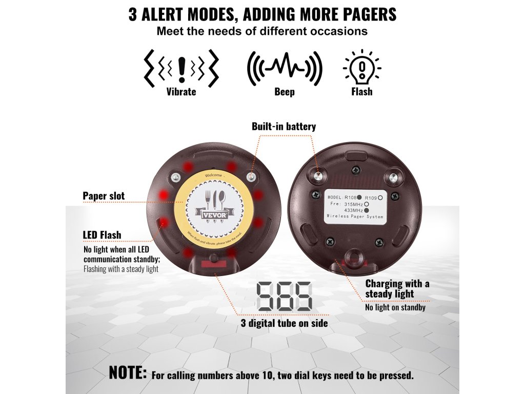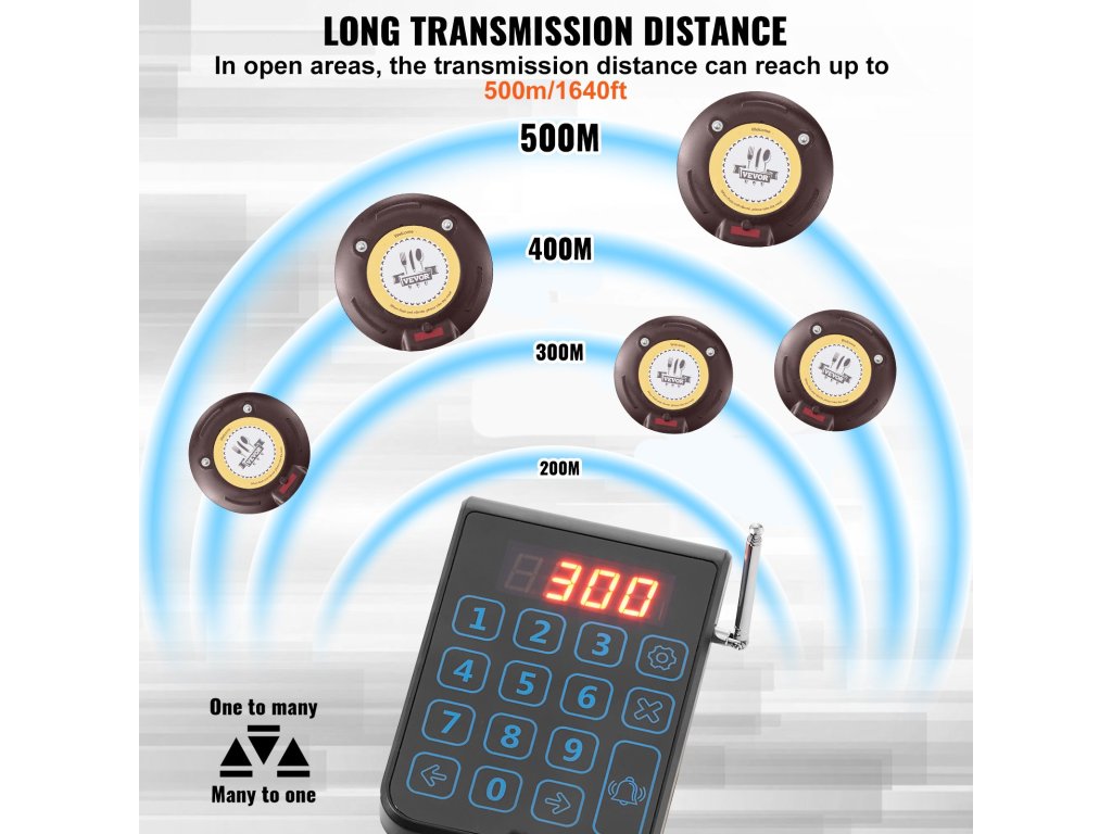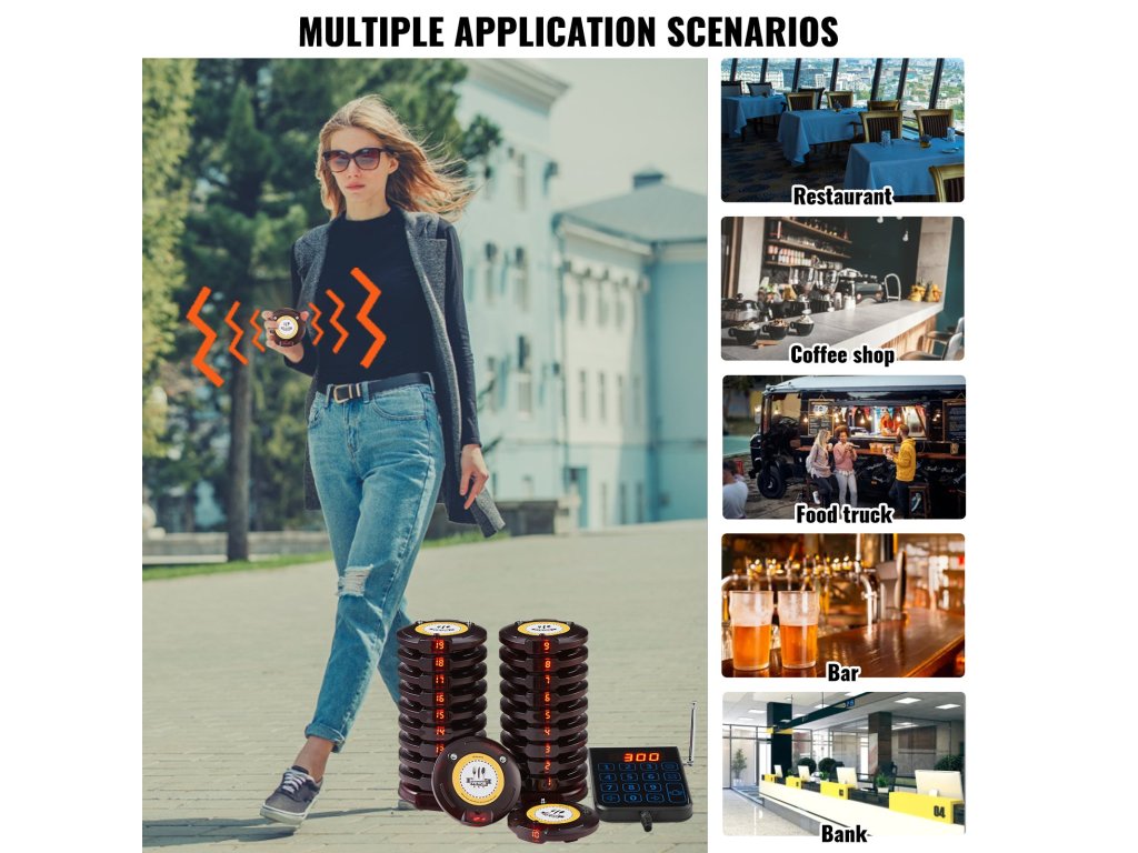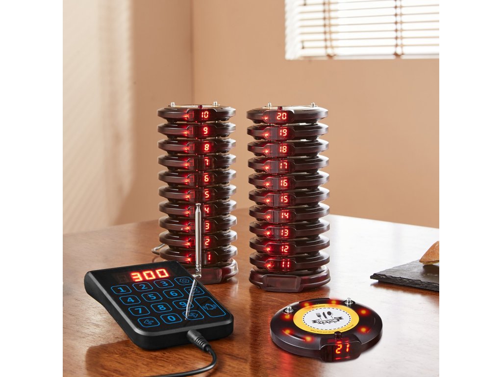 A szociális távolságtartó csipogó LED-es riasztási módokkal, rezgőmotorral és hangjelzéssel rendelkezik. Az ügyfelek még egy zajos étteremben is hallják a hangjelzést. A személyhívó rendszer érintésérzékeny billentyűzetet használ a könnyű kezelhetőség érdekében. A párosítási utasításokat tartalmazó címke a meghitt felhasználói élményt szolgálja.