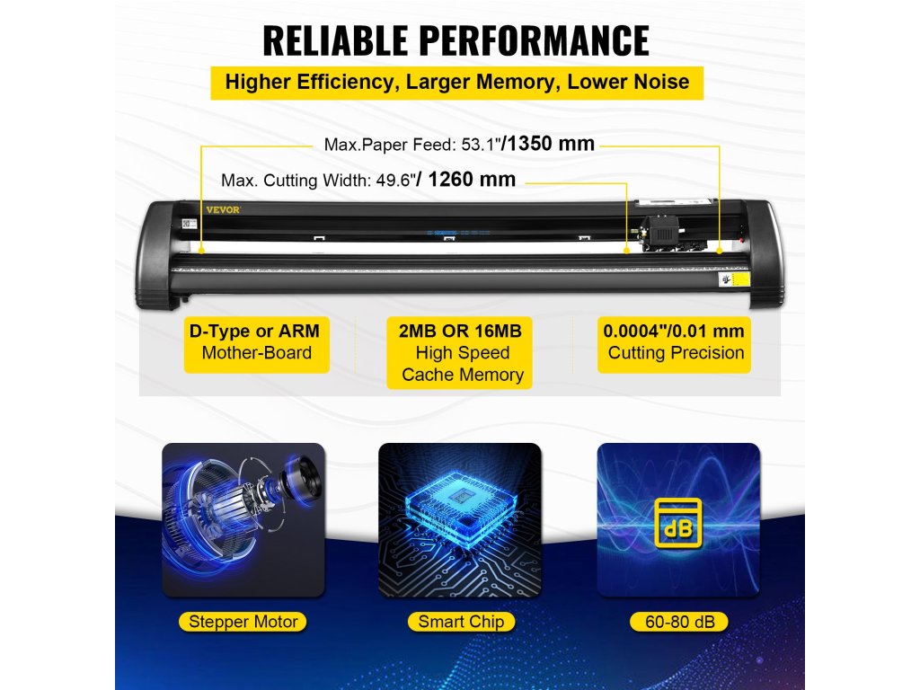 Az 53" / 1350 mm-es nagy papíradagolóval és 49,6" / 1260 mm-es vágási szélességgel ez a vinilvágó nagy vágási pontossággal és papíradagolási pontossággal rendelkezik, jelentősen növelve a munka hatékonyságát.