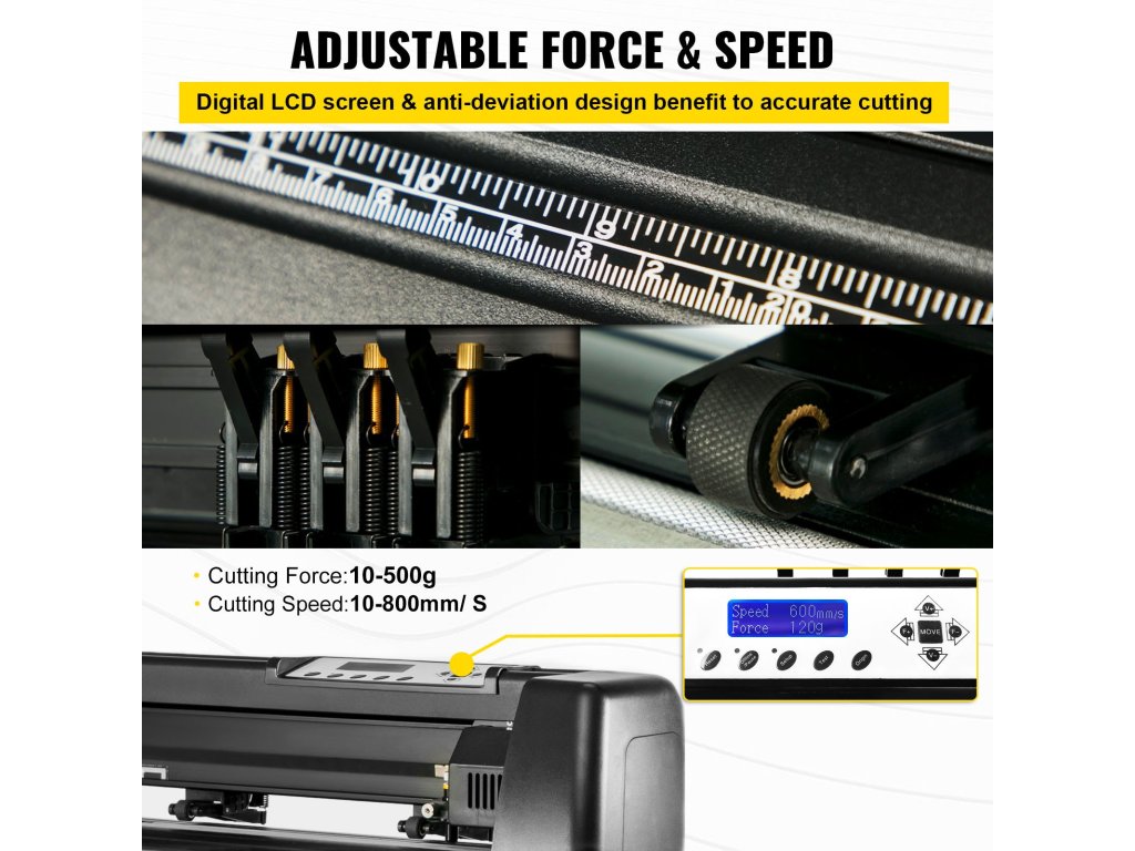A vinilvágógép háttérvilágítású kijelzővel van felszerelve, amely tovább növeli a tisztaságot és a fényerőt. A digitális erő- és sebességbeállítások kezelik a vágási folyamatot. Vágási sebesség: 10-800 mm/s; vágási erő: 10-500 g.