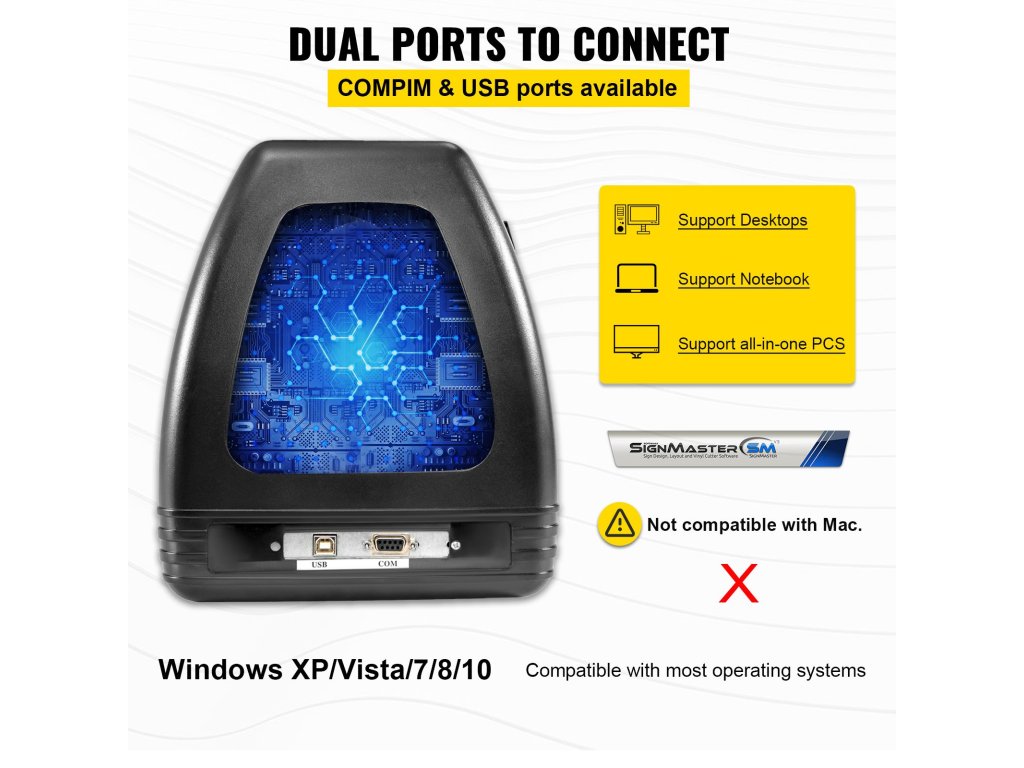 Csatlakoztassa a plotter vágógépet a 2 rendelkezésre álló porton keresztül COMPIM ÉS USB. Kompatibilis több számítógépes rendszerrel, pl. Windows XP/Vista/7/8/10. Alapvető Signmaster vágószoftverrel felszerelve, amely különböző képformátumokhoz alkalmas.