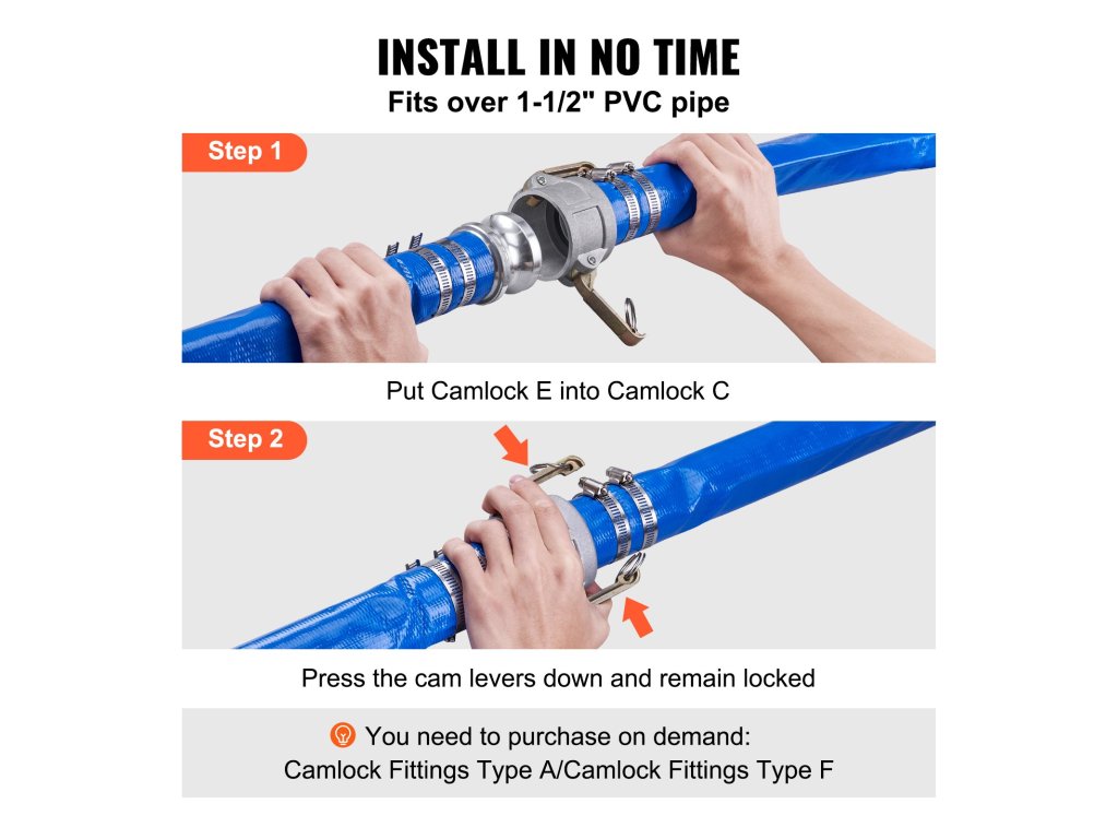 A Camlock C & E szerelvényeknek és a mellékelt 4 tömlőbilincsnek köszönhetően ez a medence leeresztő tömlő pillanatok alatt felszerelhető. Zökkenőmentesen csatlakozik az Ön 1-1/2 hüvelykes vízvezetékeihez, és megakadályozza a vízszivárgást.