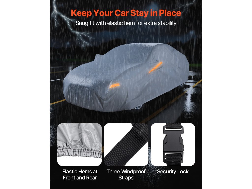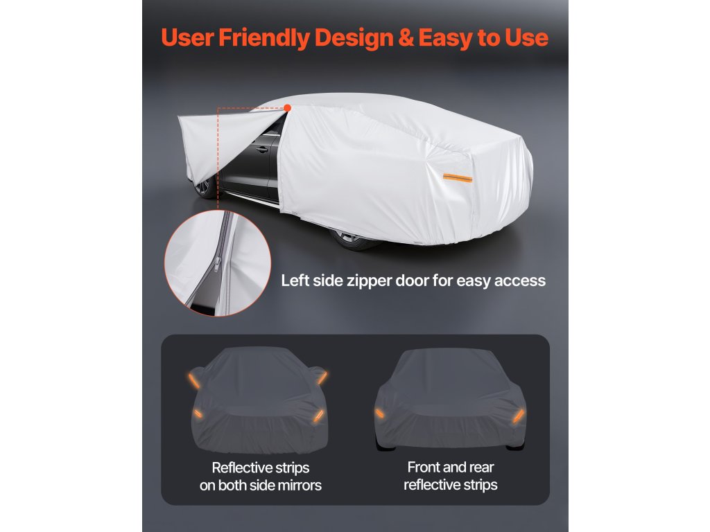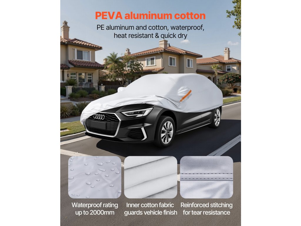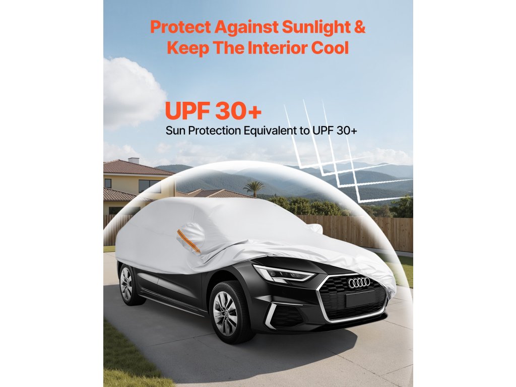 A VEVOR autófedél autókhoz vízálló réteggel van bevonva, így ideális esős vagy havas időjárás esetén. Az ezüstszínű UV30+ bevonat blokkolja a káros napfényt, így nagyszerű védelmet nyújt a napsütés ellen. Nagyszerű megoldás járművének védelmére bármilyen időjárás esetén.