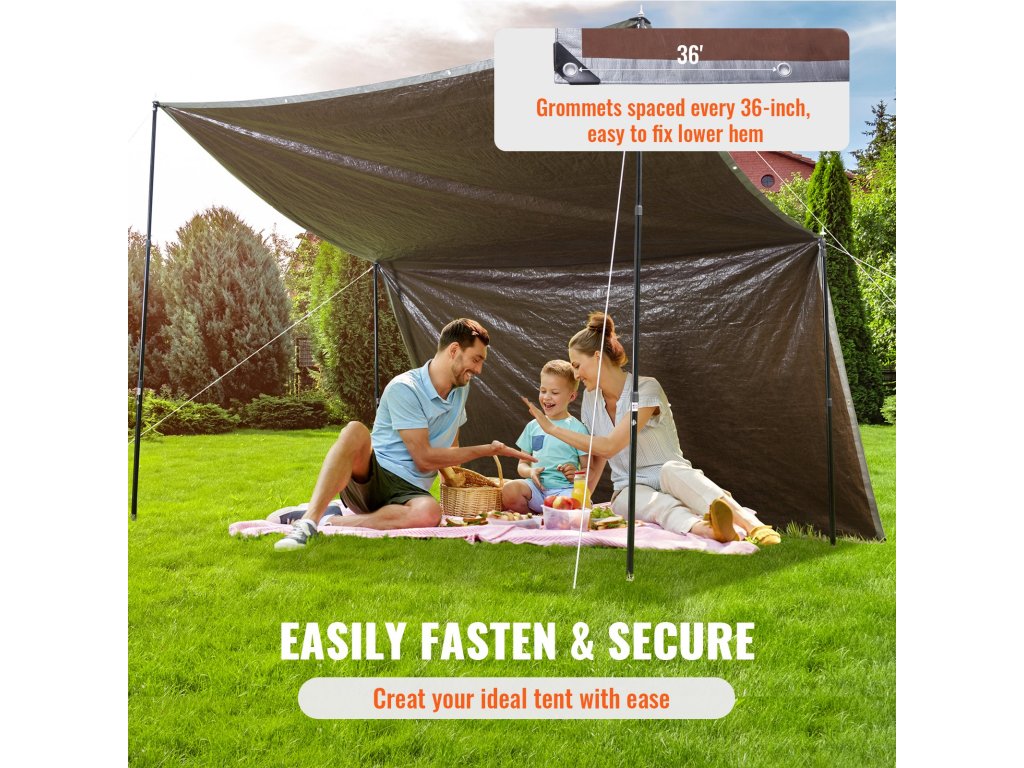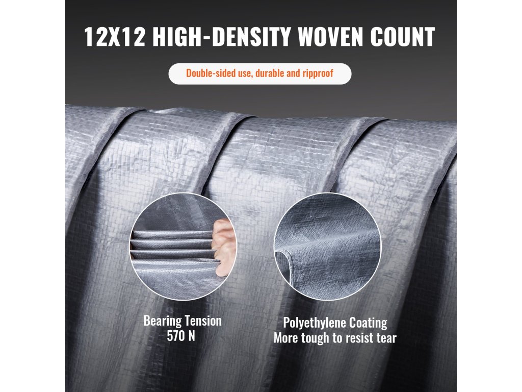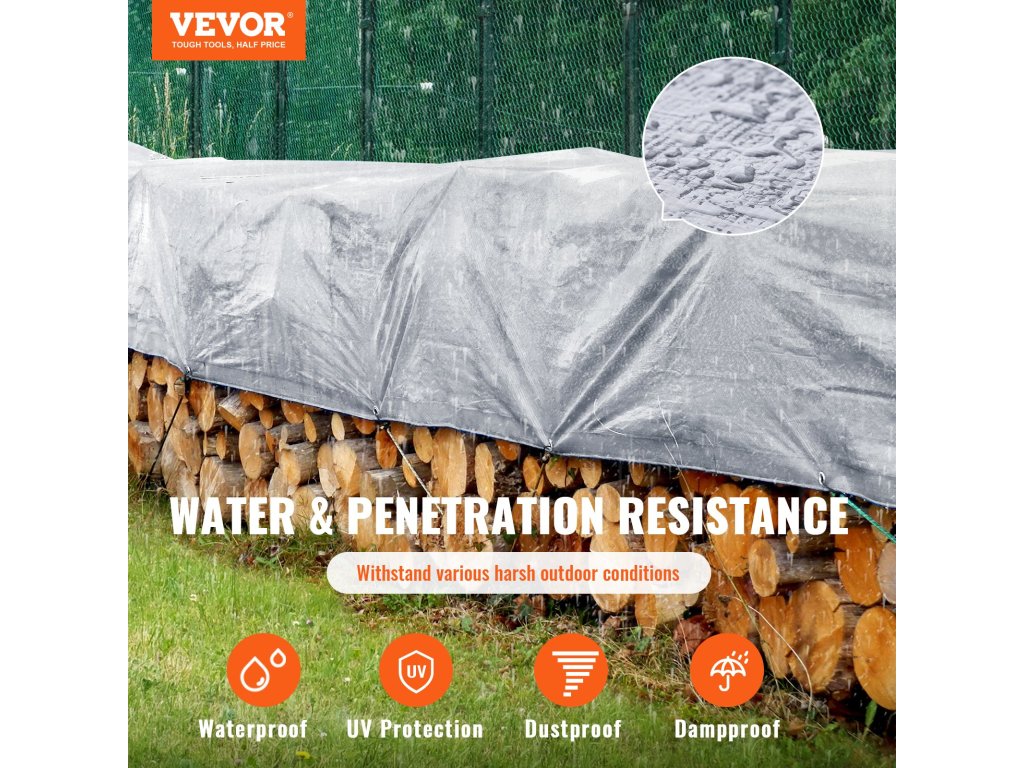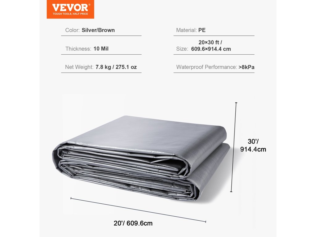 Vodotesná plachta VEVOR 20x30 ft poskytuje silnú ochranu pre všetky vaše outdoorové potreby. Je vyrobená z vysokokvalitného polyetylénového materiálu. Vďaka tomu dokáže odolávať nepriaznivým poveternostným podmienkam. Plachta je vodotesná. Svoje veci môžete prikryť spoľahlivou plachtou. Je ideálna na zakrytie vonkajšieho vybavenia a vozidiel alebo na ochranu vašej záhrady. Hrúbka 10 milimetrov zvyšuje jej odolnosť. Preto je ideálnou voľbou na dlhodobé používanie v exteriéri. Strieborná a hnedá farebná schéma dobre ladí s prírodným prostredím. Táto plachta ponúka pokoj, pretože viete, že vaše predmety sú dobre chránené.