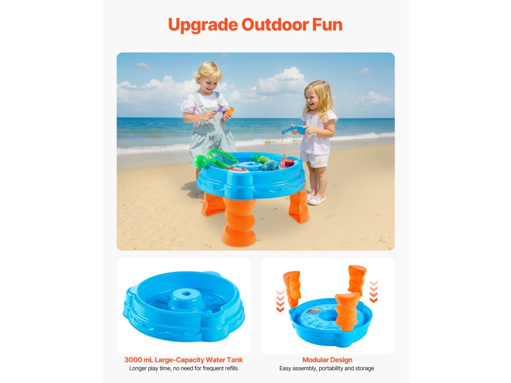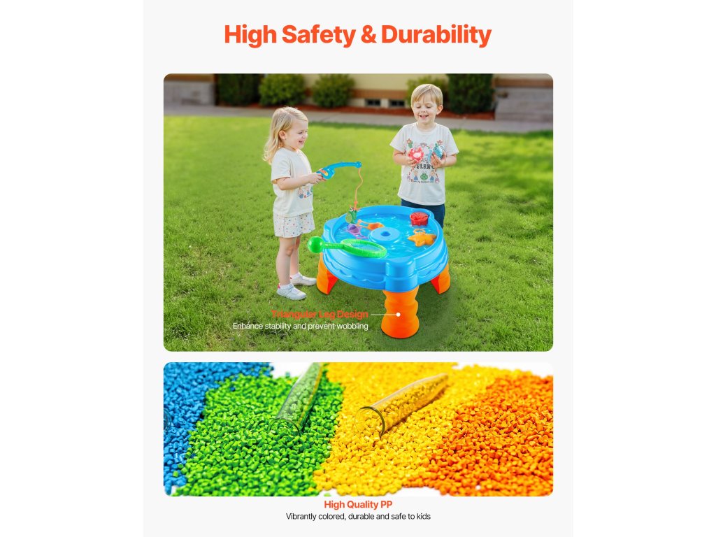 Ez a nyári vízi aktivitási asztal kiváló minőségű, gyermekbiztos PP anyagból készült, amely garantálja a tartósságot és a hosszú távú játékot. A háromszög alakú lábak kialakítása fokozott stabilitást biztosít, megakadályozza a billegést és biztonságos környezetet biztosít a játékhoz.