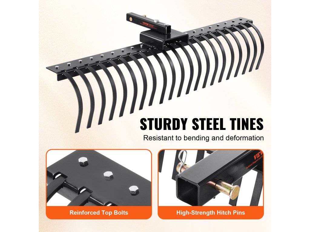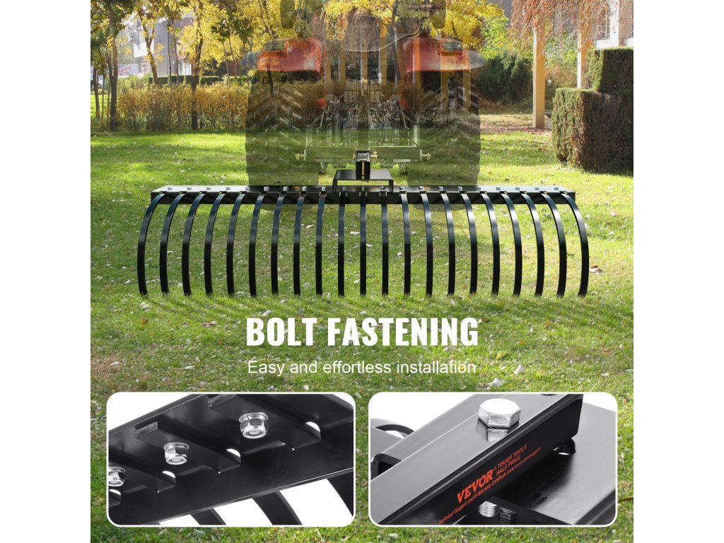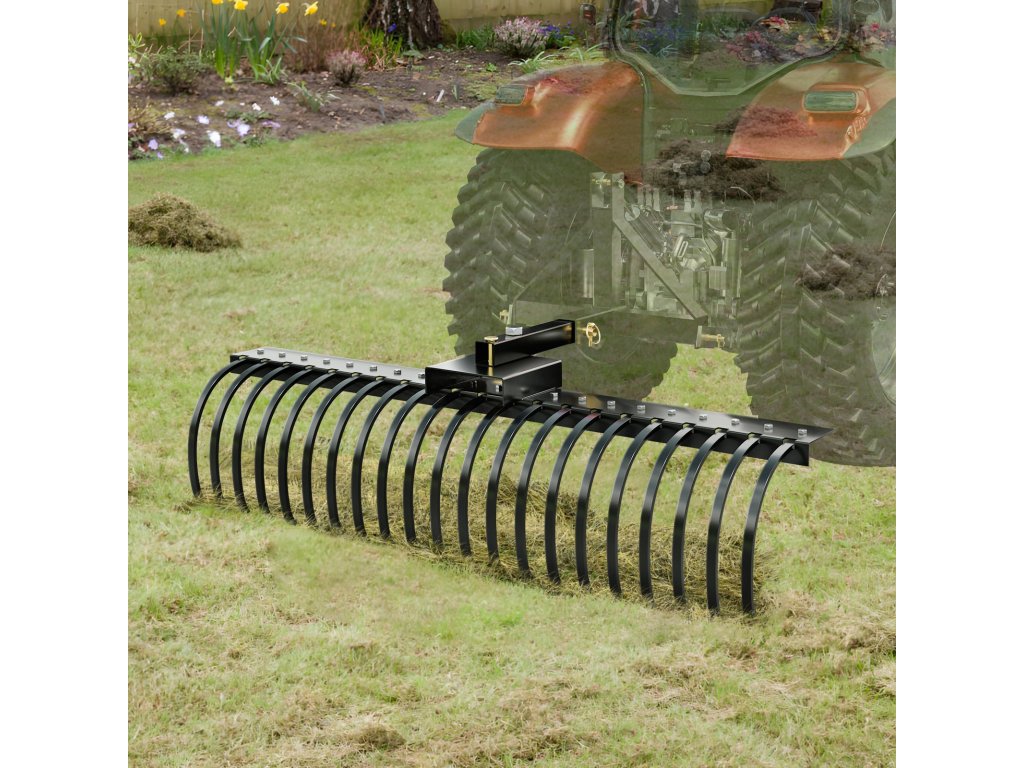 A húzó fűgereblye 48 vagy 60 colos szerszámsínekkel és hárompontos felfüggesztési rendszerrel használható.