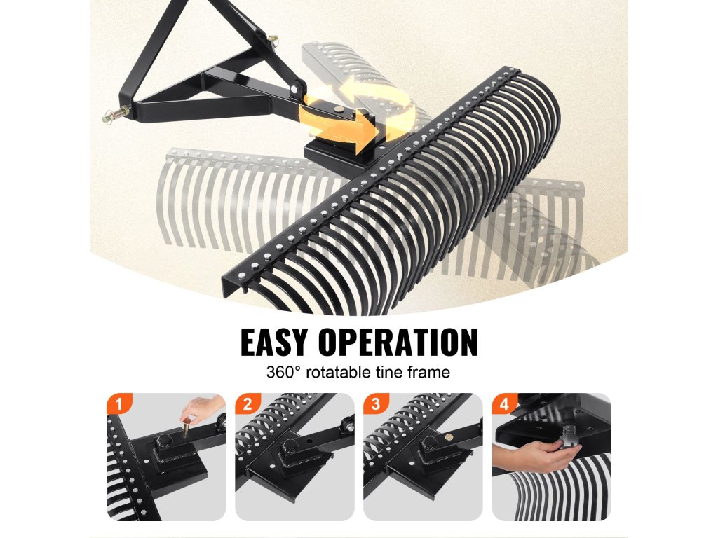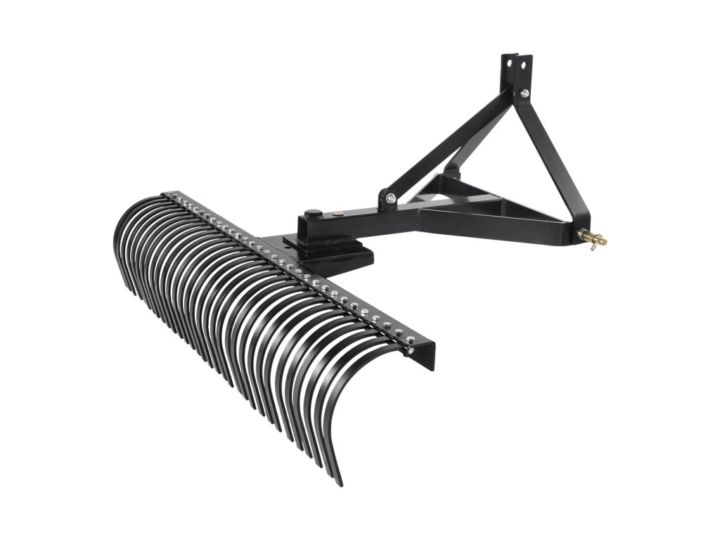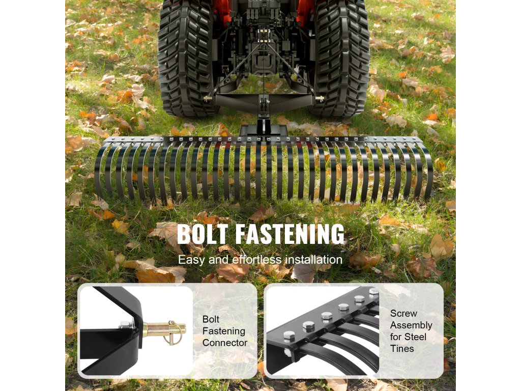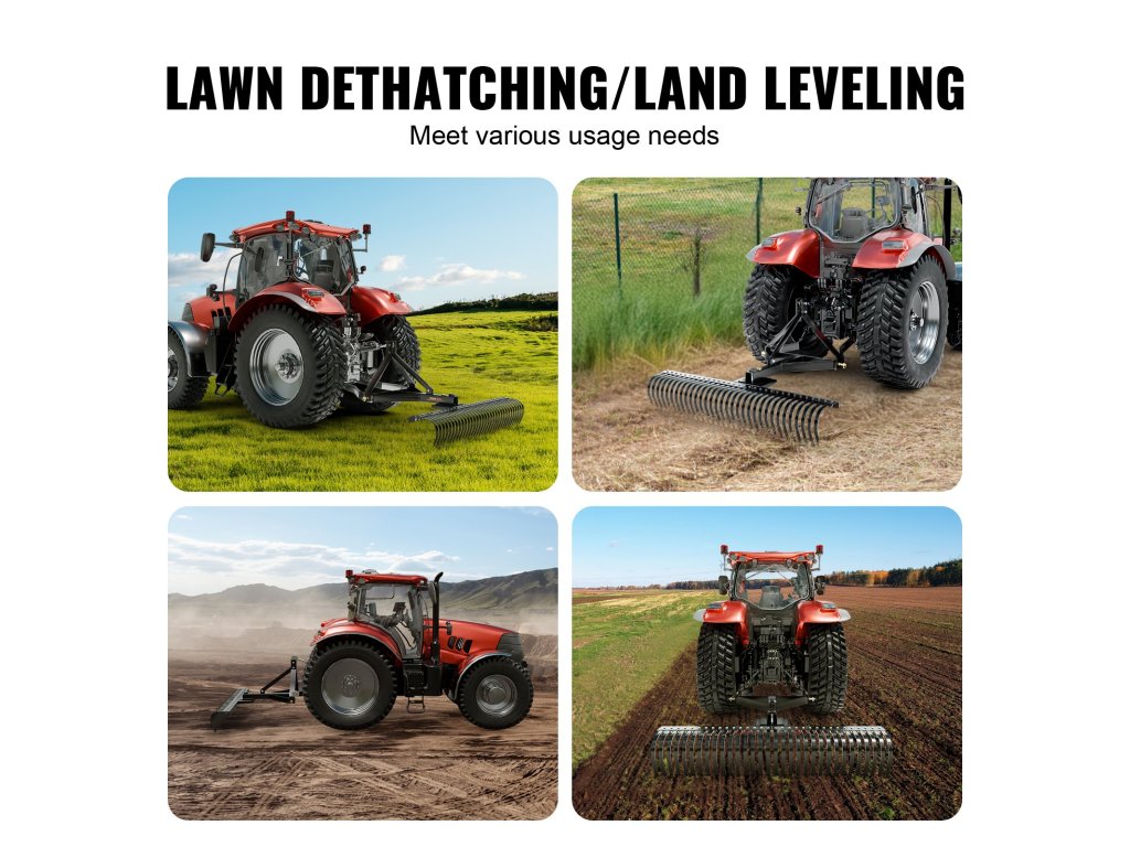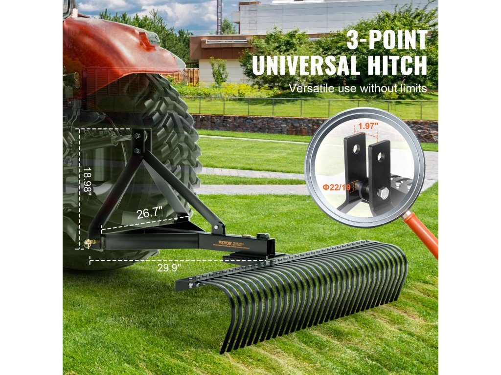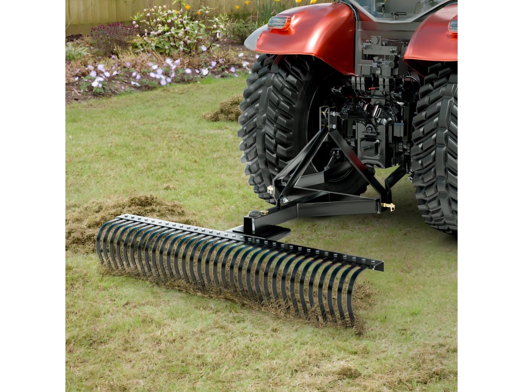 Ez a nagy teherbírású, hárompontos vontatós kaparógép tartozékkal szilárdan rögzíti az acél fogakat a talajhoz, erős tapadást biztosítva, és hatékonyan távolítja el a gyomokat a gyepből.