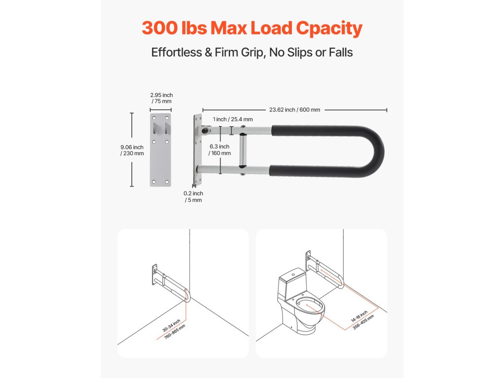 WC-tartó fogantyú 23,8 hüvelykes, összecsukható, csúszásgátló, teherbírás 300 font