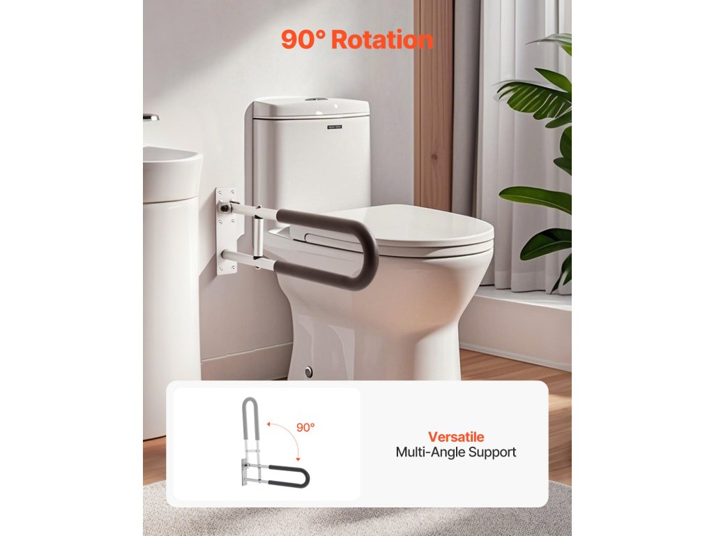 A billenő WC biztonsági korlátunk 300 kg-os teherbírással rendelkezik, és segítséget nyújt a hálószobában, fürdőszobában, WC-ben stb. 0°-90°-os szögben forgatható, és lehetővé teszi a függőleges helyzetbe állítást, így helyet takarít meg a biztonság veszélyeztetése nélkül. Csak forgassa el a csavarokat, és könnyedén beállíthatja a kívánt pozíciót.