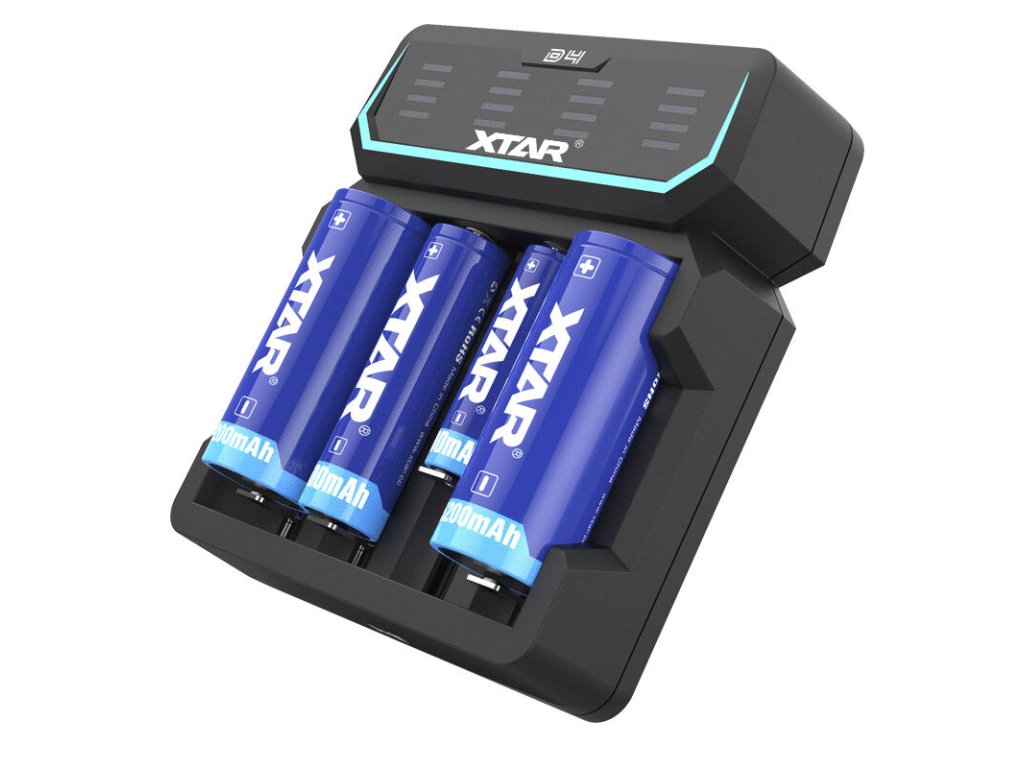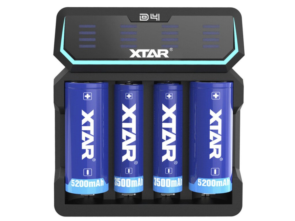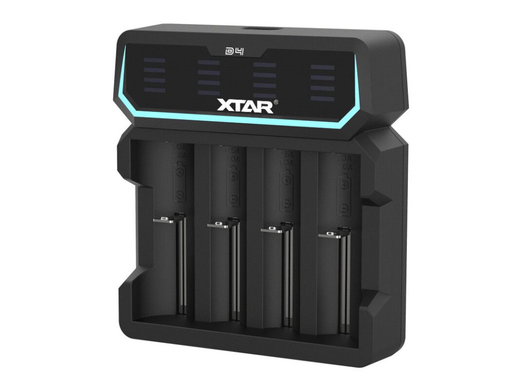 Az XTAR D4 egy innovatív gyorstöltő, amely egy intelligens eszköz különböző Li-ION cellák töltéséhez, védett és nem védett cellákhoz egyaránt. Minden töltési csatornához tartozik egy kijelző, amely a töltés előrehaladását mutatja. Ezenkívül automatikusan érzékeli az akkumulátor állapotát. Egyszerre képes 1 cellát és 4 Li-ION cellát is tölteni. A töltőn lévő kijelző több kék LED-ből áll, amelyek a töltés közben animálódnak, és jelzik a töltés előrehaladását.