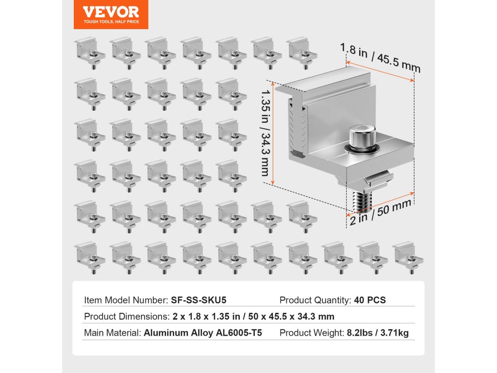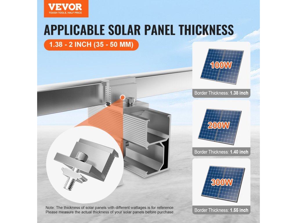 Válassza a VEVOR napelemtartó konzolt a megbízható és stabil rögzítéshez.Az állítható 35-50 mm átmérőjű végkapocs alkalmazkodik a különböző vastagságú napelemekhez, az eloxált alumíniumötvözetből készült szerkezet pedig hosszú élettartamú stabilitást biztosít, így ideális választás a napelemek telepítéséhez.