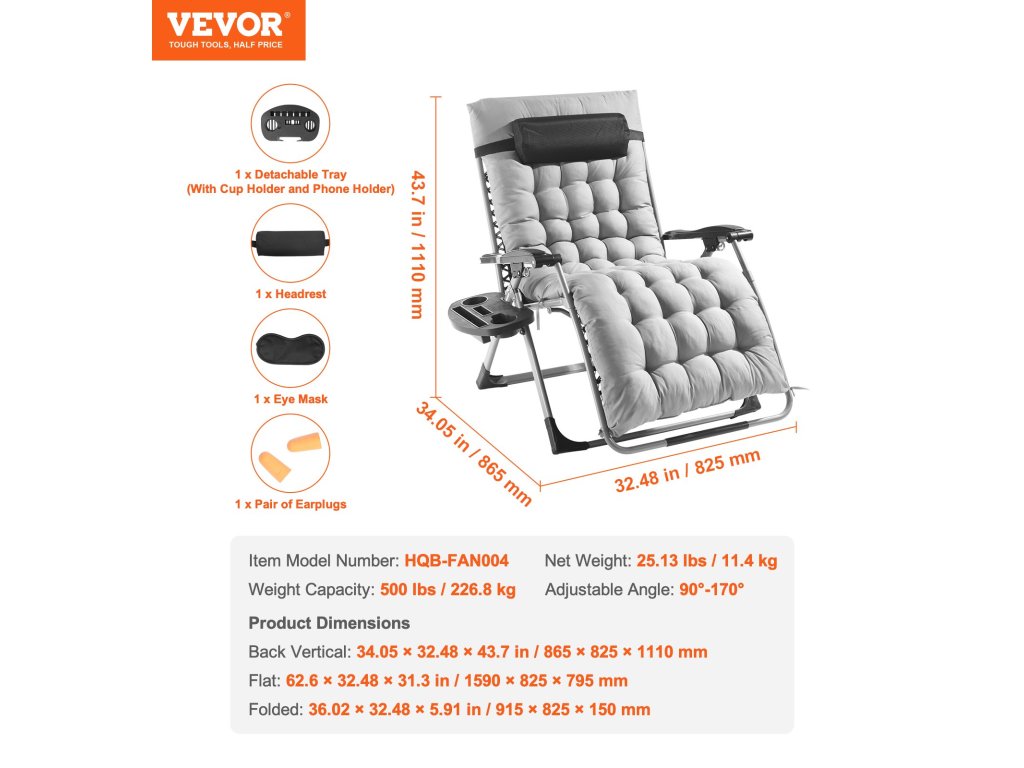 Ez a zéró gravitációs fekvőhely 33" méretű, és meghosszabbított karfákkal rendelkezik a stabil támasztás érdekében, valamint nagyméretű, csúszásmentes lábpárnákkal, amelyek puhák és nem irritálnak. Teljes kikapcsolódást biztosít a testnek és a léleknek egyaránt.