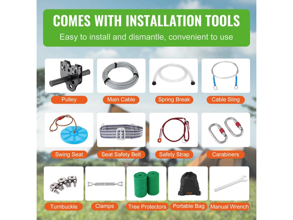 A kötélpálya-készlethez rengeteg tartozék tartozik, beleértve a biztonságosabb szabadtéri tevékenységekhez szükséges összes kültéri felszerelést. Engedje szabadjára fiatalos energiáját a legteljesebb mértékben.