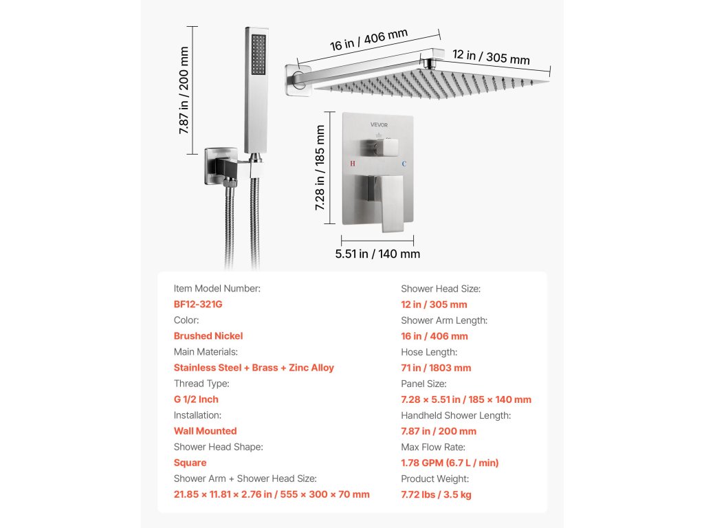 | Veľkosť sprchovej hlavice | 12 palcov/305 mm |