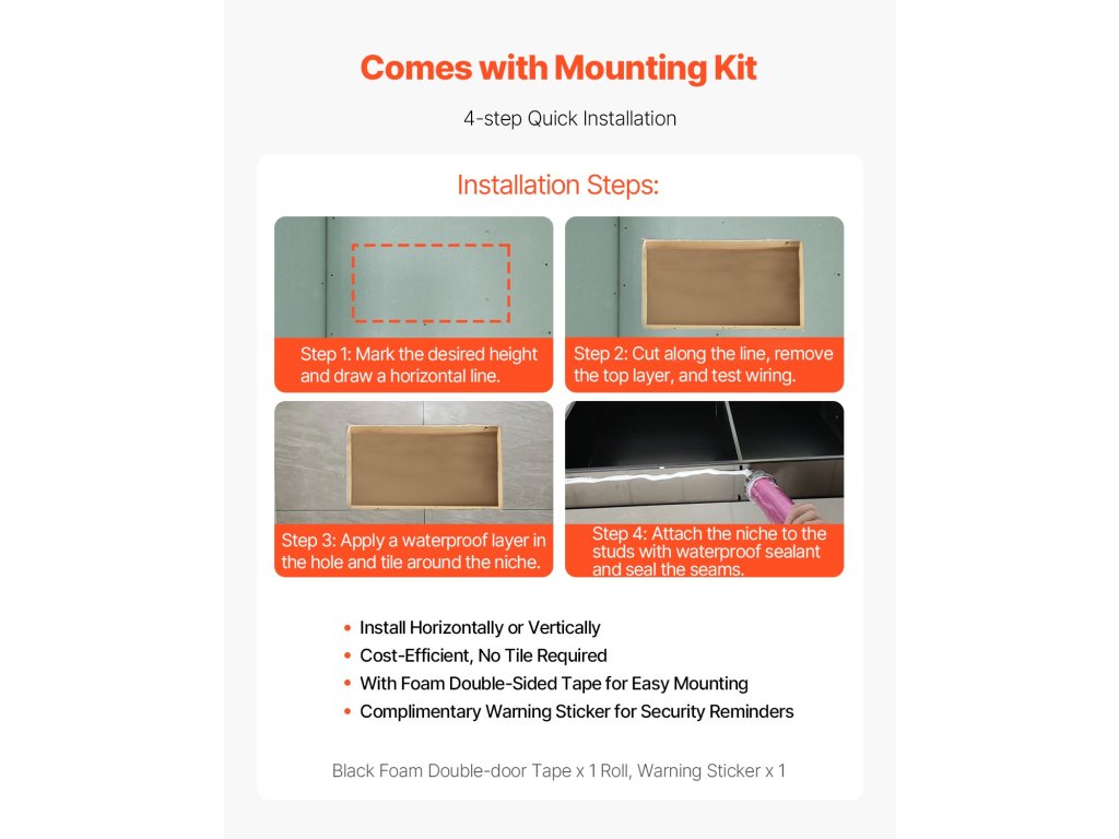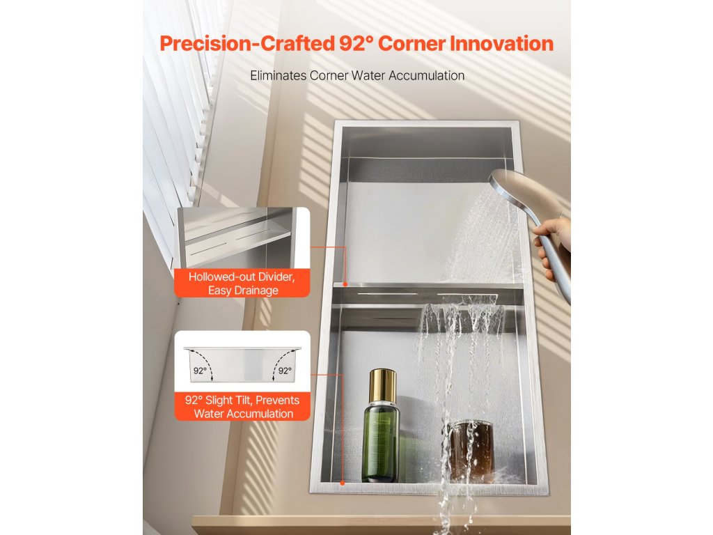 A 304 rozsdamentes acélból készült VEVOR zuhanyfülke 100%-ban zárt és vízálló, korrózióálló felületű, könnyen tisztítható és karcálló. Előre beszerelt üreges polccal rendelkezik, amely megakadályozza a víz felgyülemlését, ideális fürdőszobákba, szekrényekbe és konyhákba.