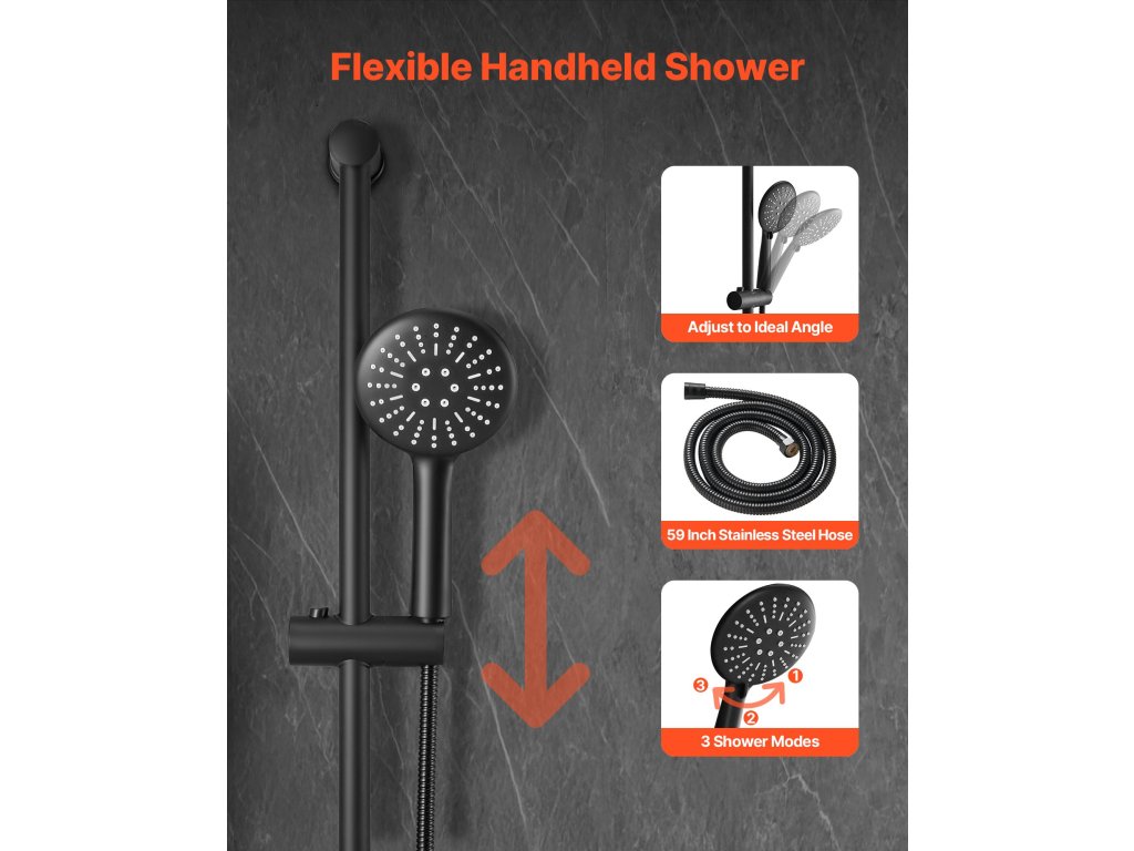 Kétfunkciós zuhanyrendszer-készletünk eső- és kézi zuhanyozási lehetőséget is kínál, és még alacsony vízszint esetén is nagynyomású vízsugarat biztosít, frissítő és pihentető zuhanyozási élményt nyújtva.