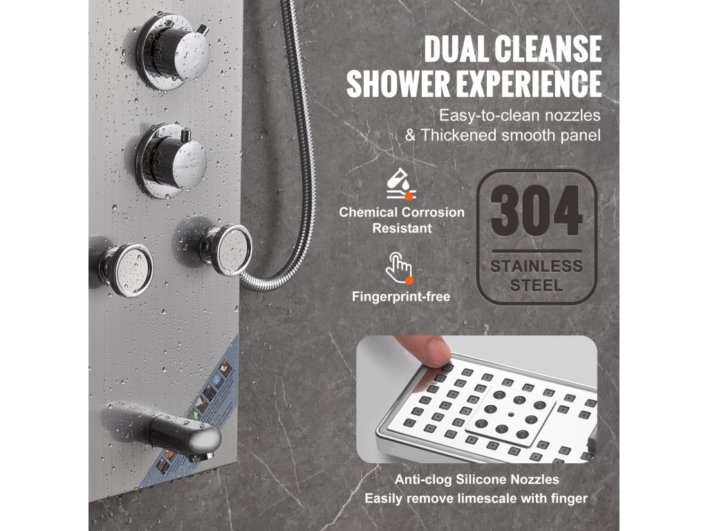 Zuhanypanelünk megerősített 304 rozsdamentes acélból készült, amely garantálja a tartósságot és a higiéniát, ellenáll a korróziónak és könnyen tisztítható. A sárgaréz vízkeverő szelep és a dupla PVC robbanásbiztos cső, valamint a fonott 304 rozsdamentes acélból készült fúvóka robusztus és szivárgásmentes rendszert biztosít.