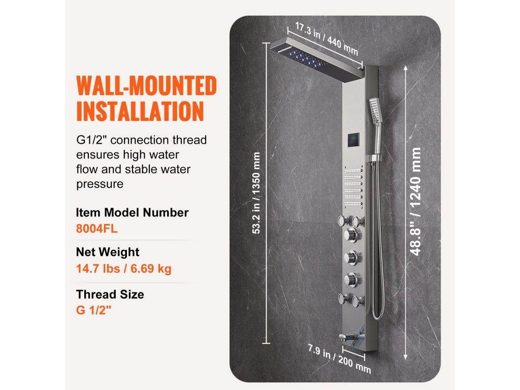 A G 1/2" csatlakozómenetes méret garantálja a nagy vízkibocsátást és a stabil nyomást, így ez a zuhanyrendszer testsugarakkal közvetlenül illeszkedik a legtöbb fürdőszobai szerelvényhez és vízvezeték-szerelvényhez, átalakító nélkül.