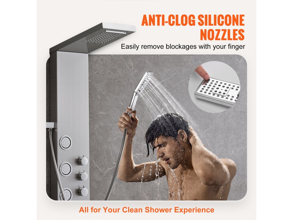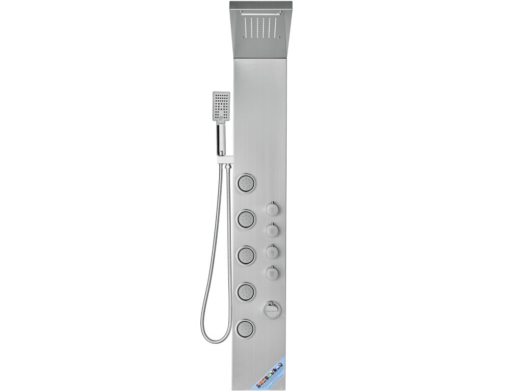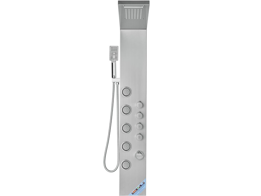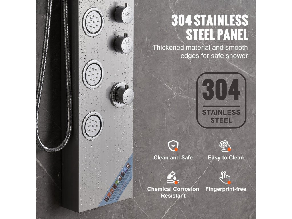 Zuhanypanelünk megerősített 304 rozsdamentes acéllemezből készül, amely biztosítja a tartósságot és a higiéniát, ellenáll a korróziónak és könnyen tisztítható. A sárgaréz vízkeverő szelep és a dupla PVC robbanásbiztos cső, valamint a fonott 304 rozsdamentes acélból készült fúvóka robusztus és tömör rendszert biztosít.