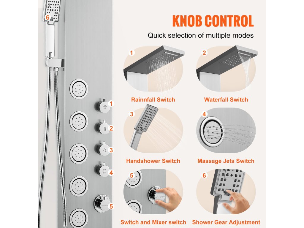 A kívánt zuhanyozási mód és vízhőmérséklet könnyen kiválasztható a szabályozógombbal; zuhanyrendszerünket személyre szabott zuhanyozásra terveztük. A stabil víznyomás és vízhőmérséklet fenntartása érdekében nem ajánlott egyszerre több üzemmódot használni.
