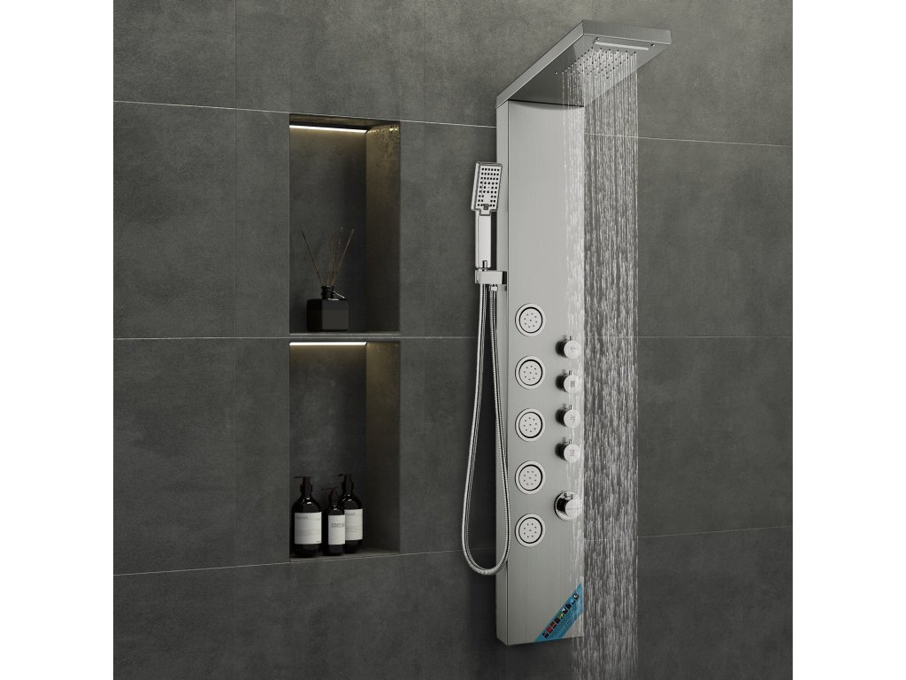 Zuhanypanel rozsdamentes acélból, 4 üzemmód, eső/vízesés, 5 fúvóka, 3 kézi beállítás, 59"