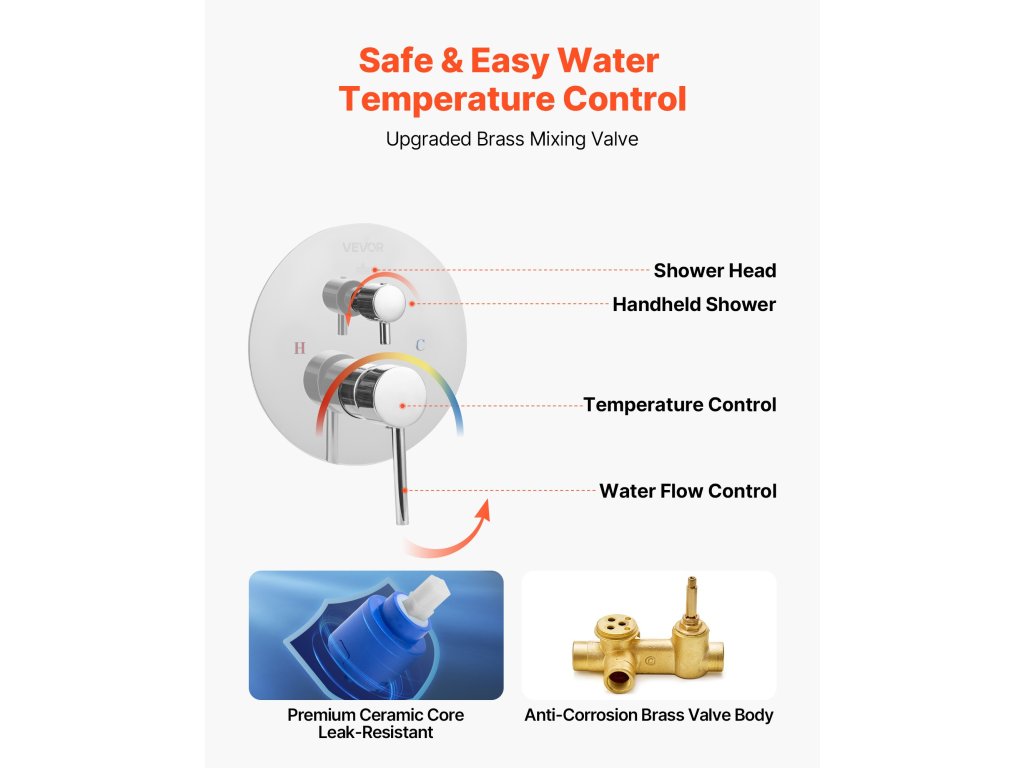 Kétfunkciós zuhanyrendszer-készletünk eső- és kézi zuhanyozási lehetőséget is kínál, és még alacsony vízszint esetén is nagynyomású vízsugarat biztosít, frissítő és pihentető zuhanyozási élményt nyújtva.