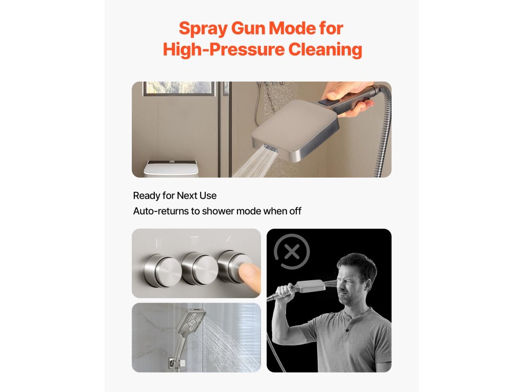 Ennél az esőzuhany-rendszernél a kézi sugár bezárás után automatikusan visszatér zuhanyzási üzemmódba, így megakadályozza a véletlen permetezést a következő használat során.